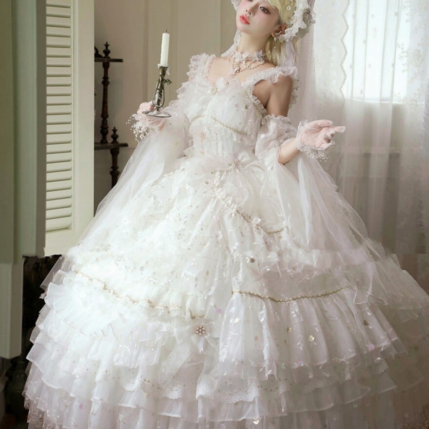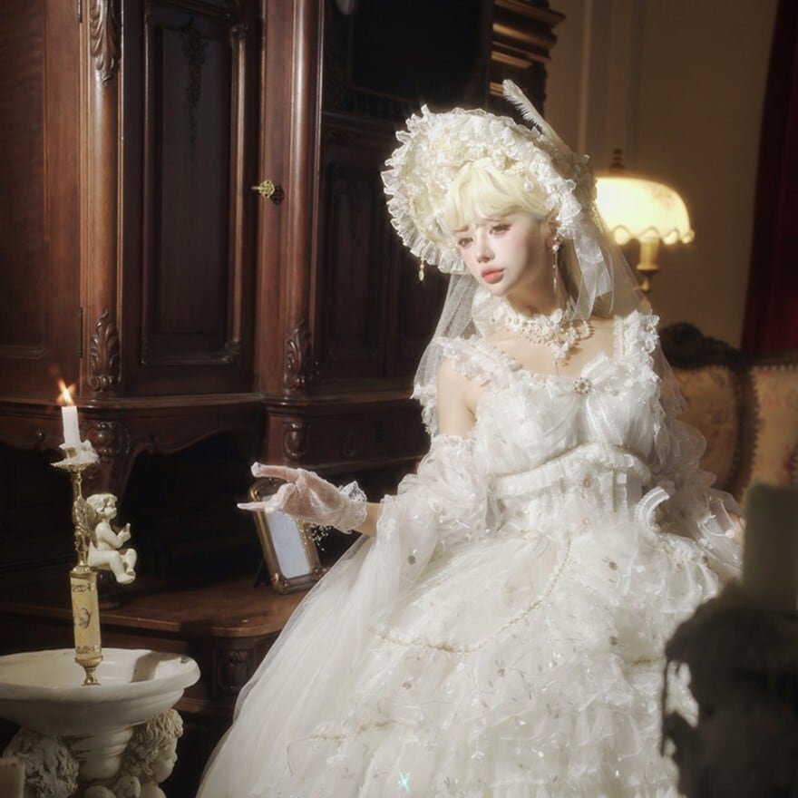 幾重にも重なるフリルと、繊細なレースが織りなすハーモニーは、まるでウェディングドレスのような神聖な美しさ。