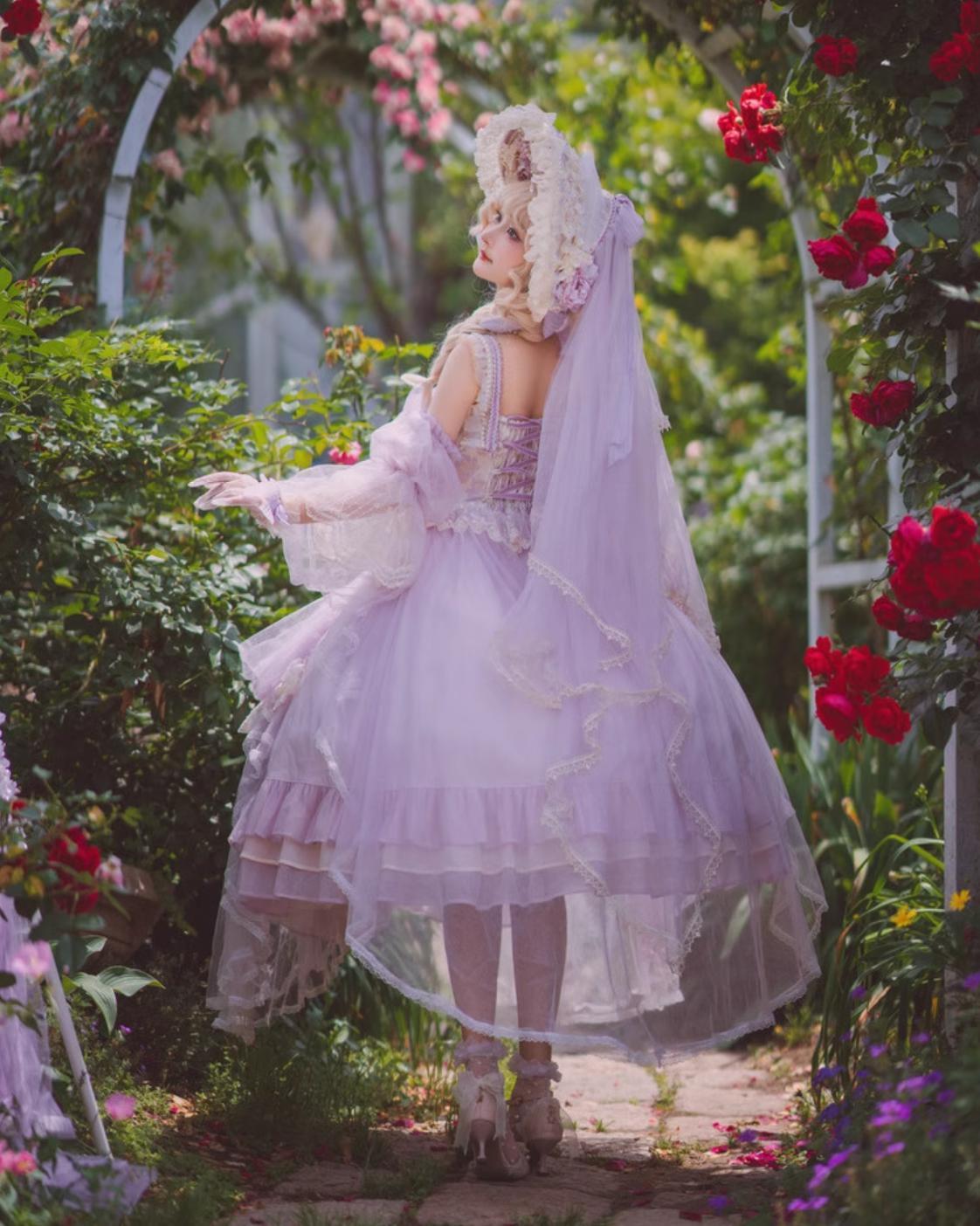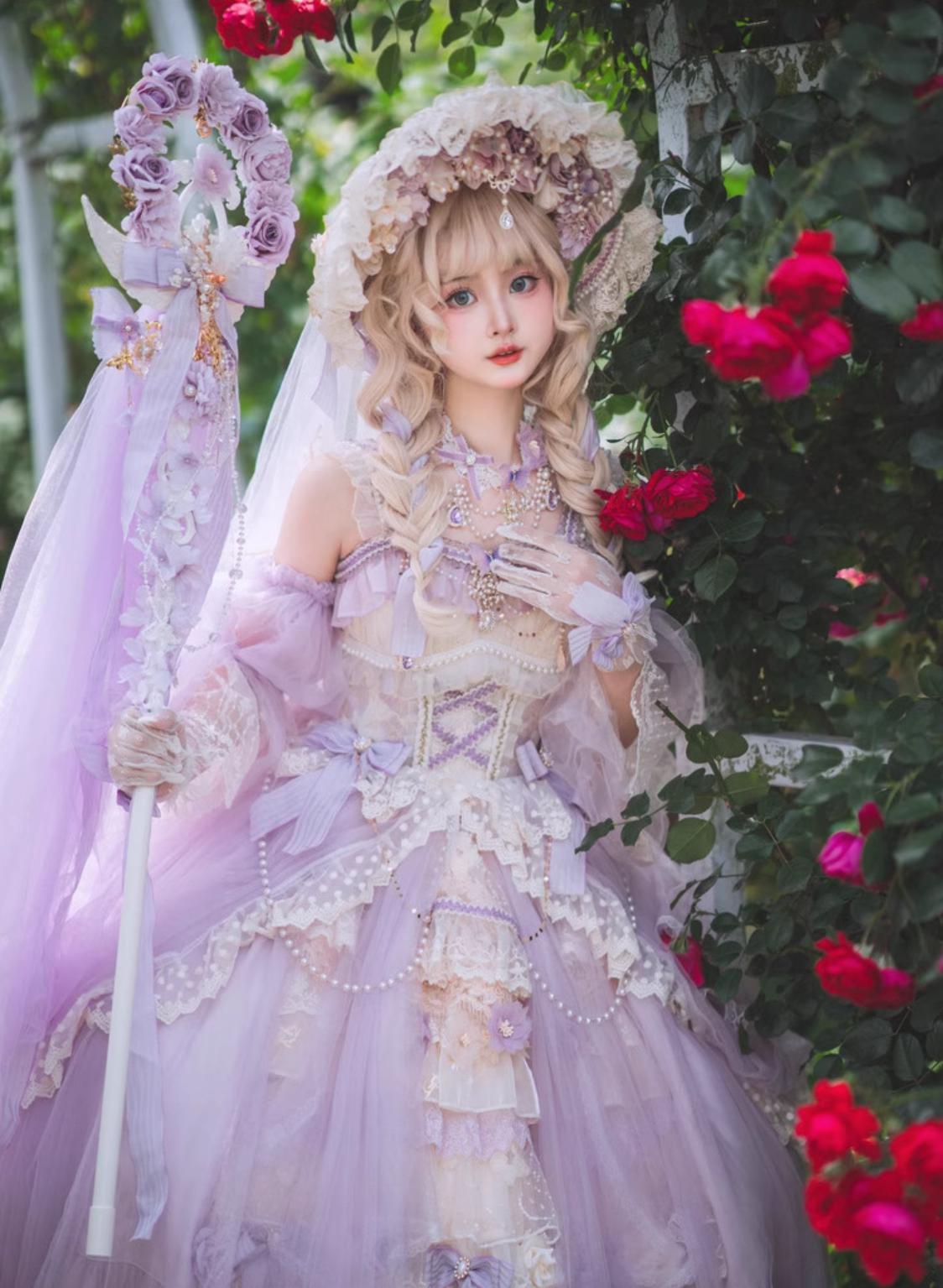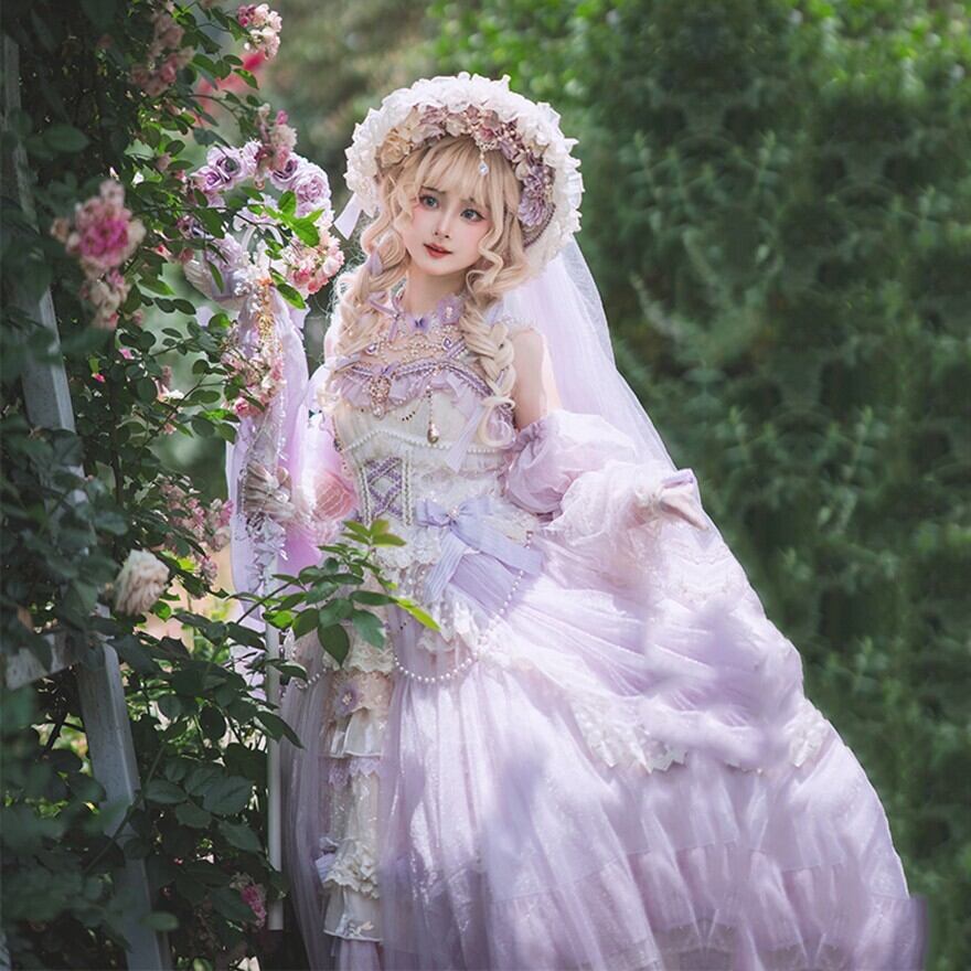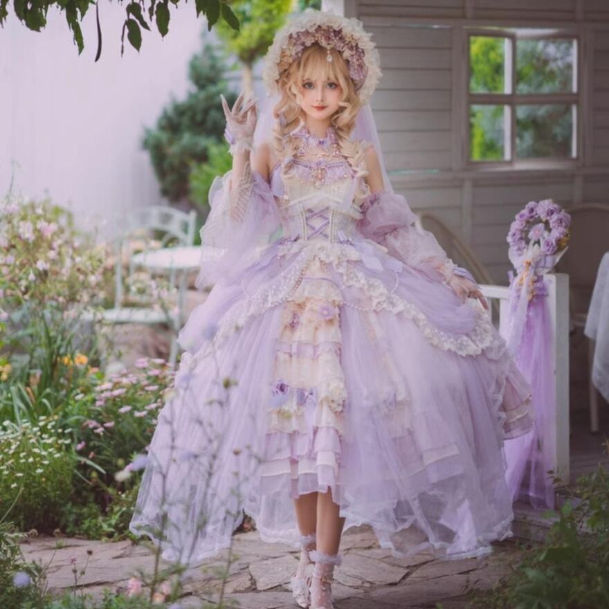 淡いラベンダーカラーをベースに、繊細なレースやフリルが贅沢にあしらわれ、まるで妖精のような可憐さを演出。