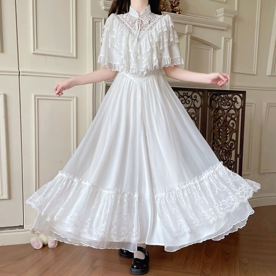 ・肩を覆うケープのようなデザインが、優雅でロマンティックな雰囲気を演出します。