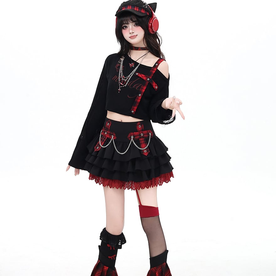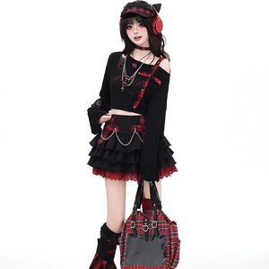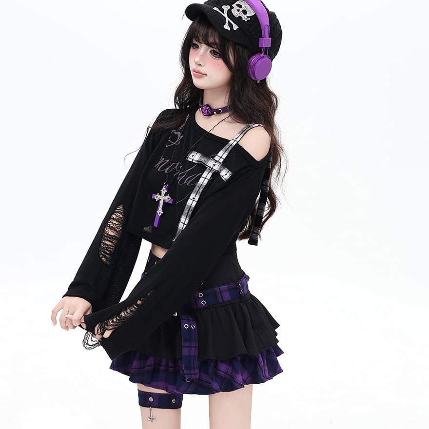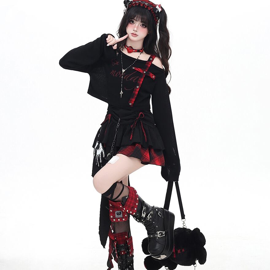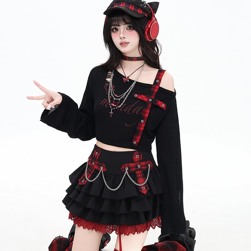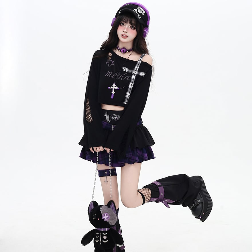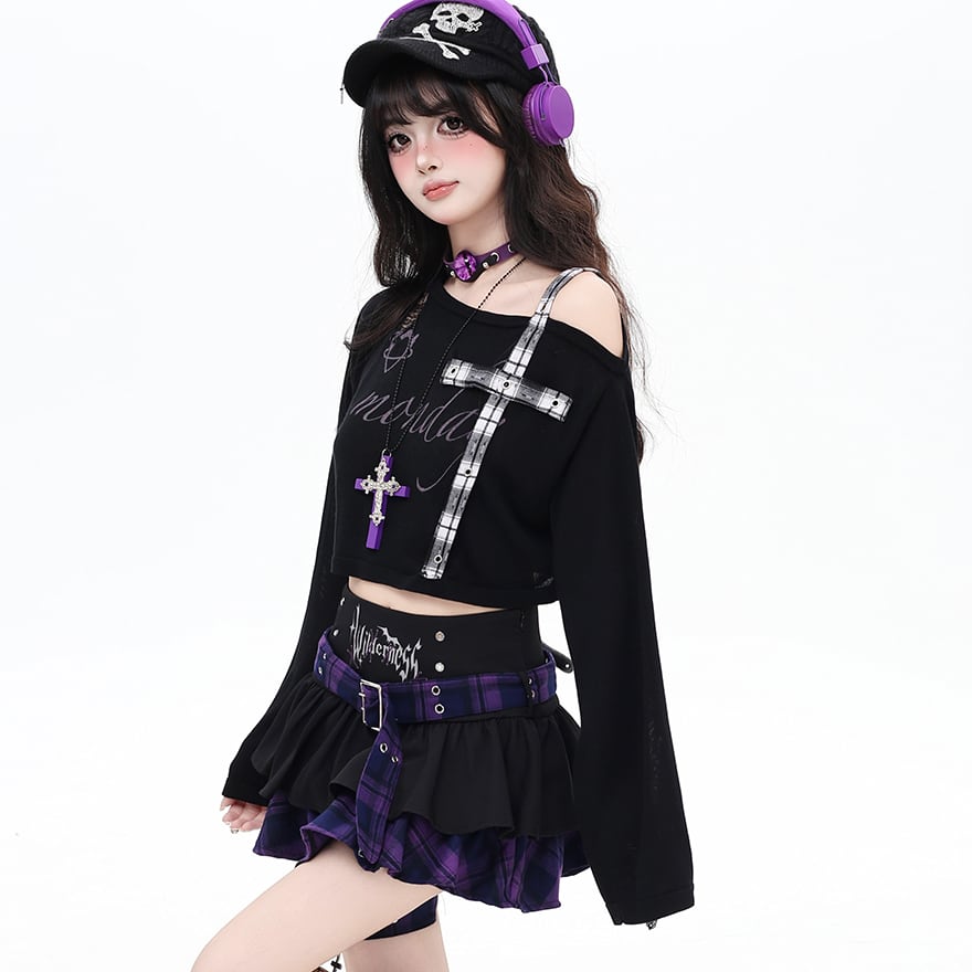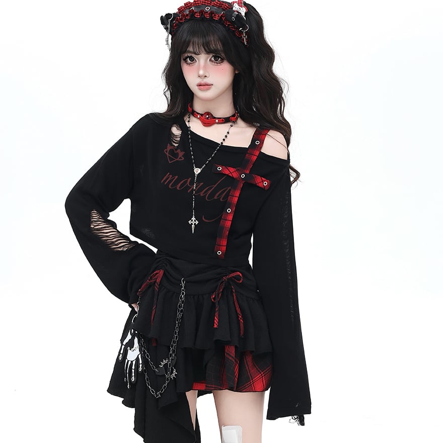 関連キーワード: #サブカル系 #地雷系 #トップス #長袖 #パンク #ロック #Y2K #原宿ファッション #ダークファッション #闇かわいい #病みかわいい #チェック柄 #ダメージ加工 #肌見せ #アシンメトリー #クロップド丈