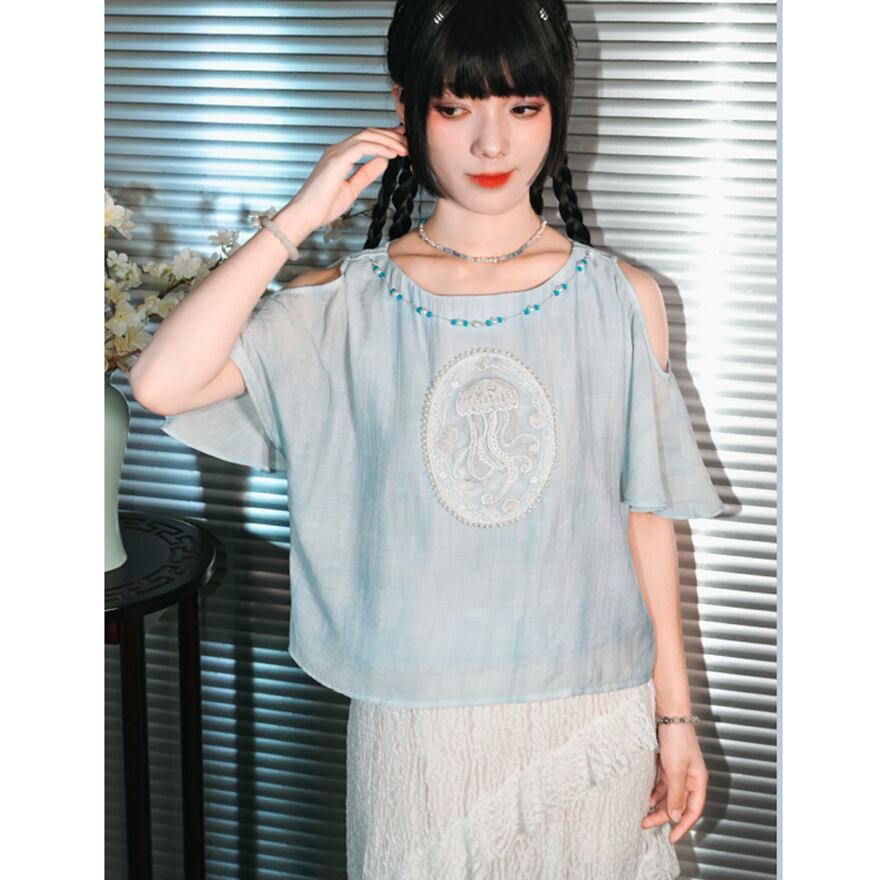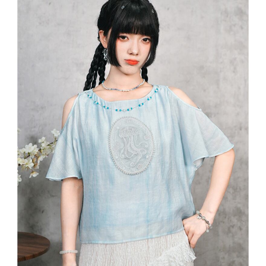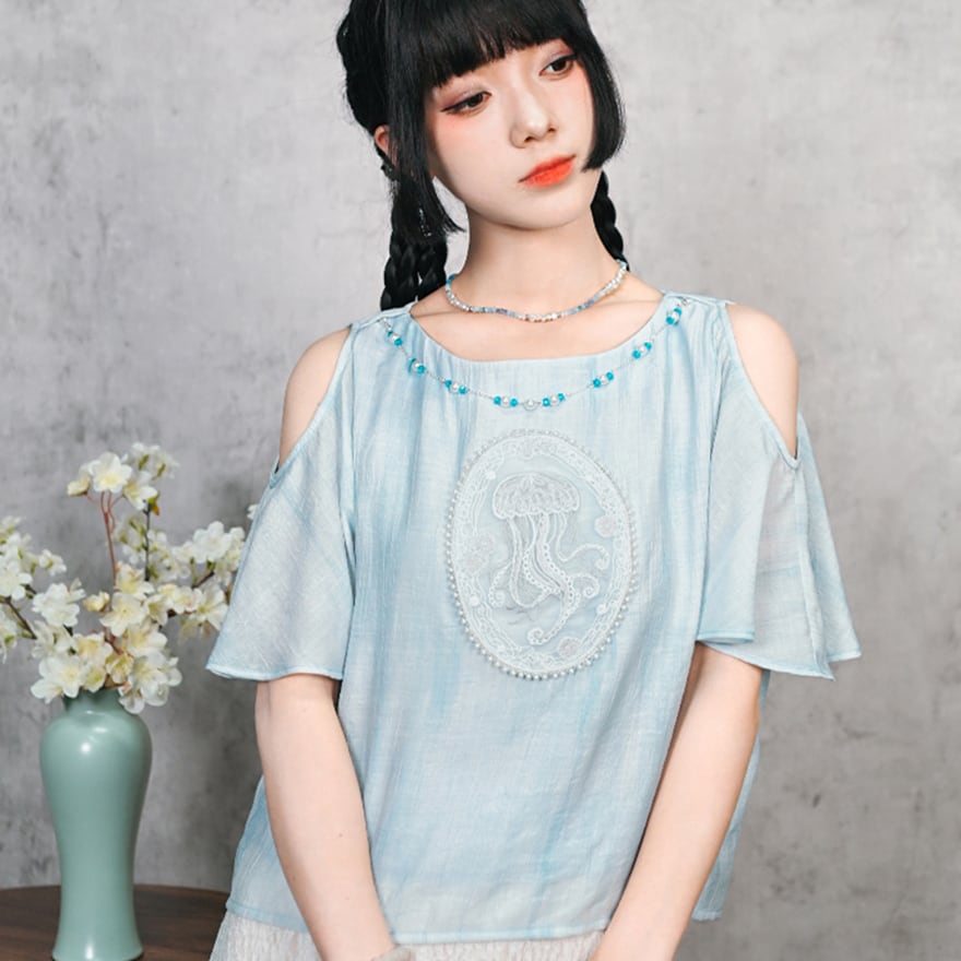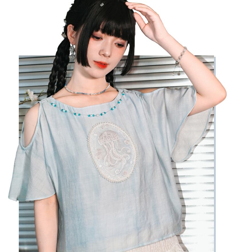 関連キーワード: #チャイナ風 #中華服 #中華系ファッション #サブカル #地雷系 #シャツ #トップス #オープンショルダー #肩見せ #刺繍 #海月 #クラゲ #フェイクパール #ビーズ #水色 #夏服 #古怪舎