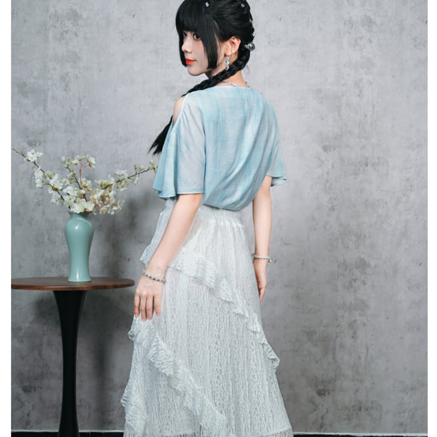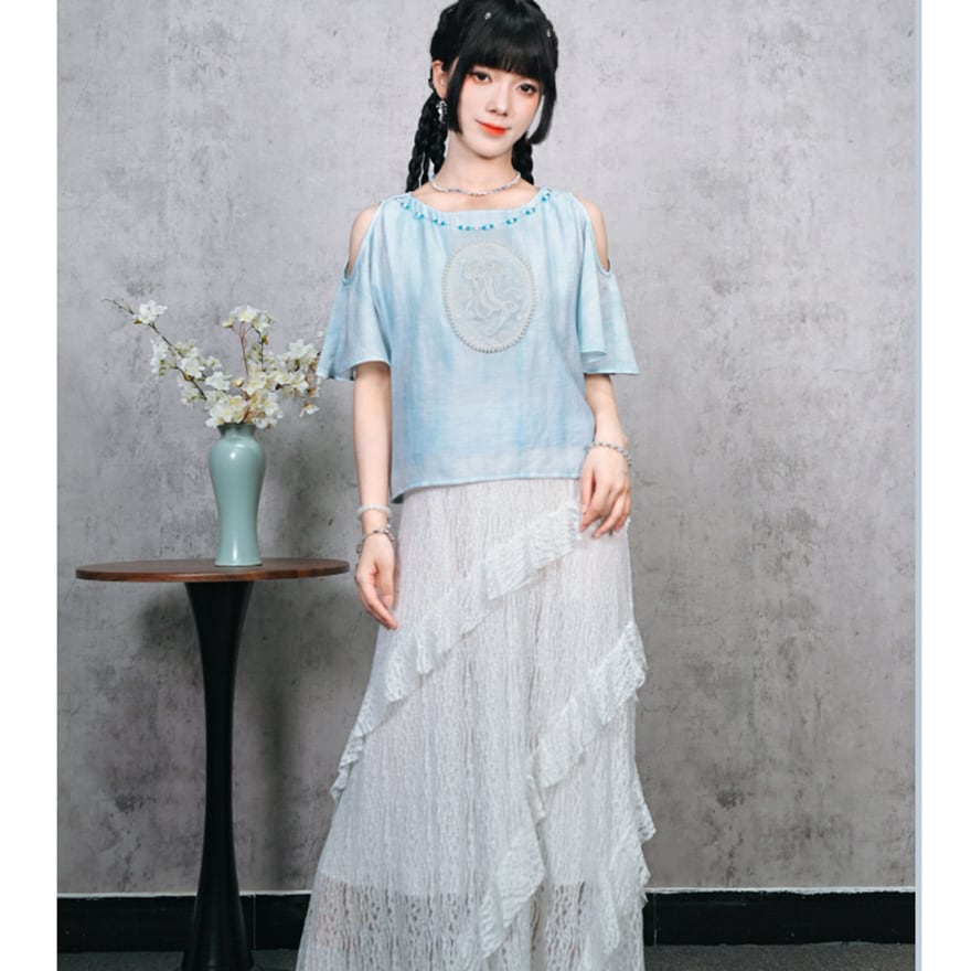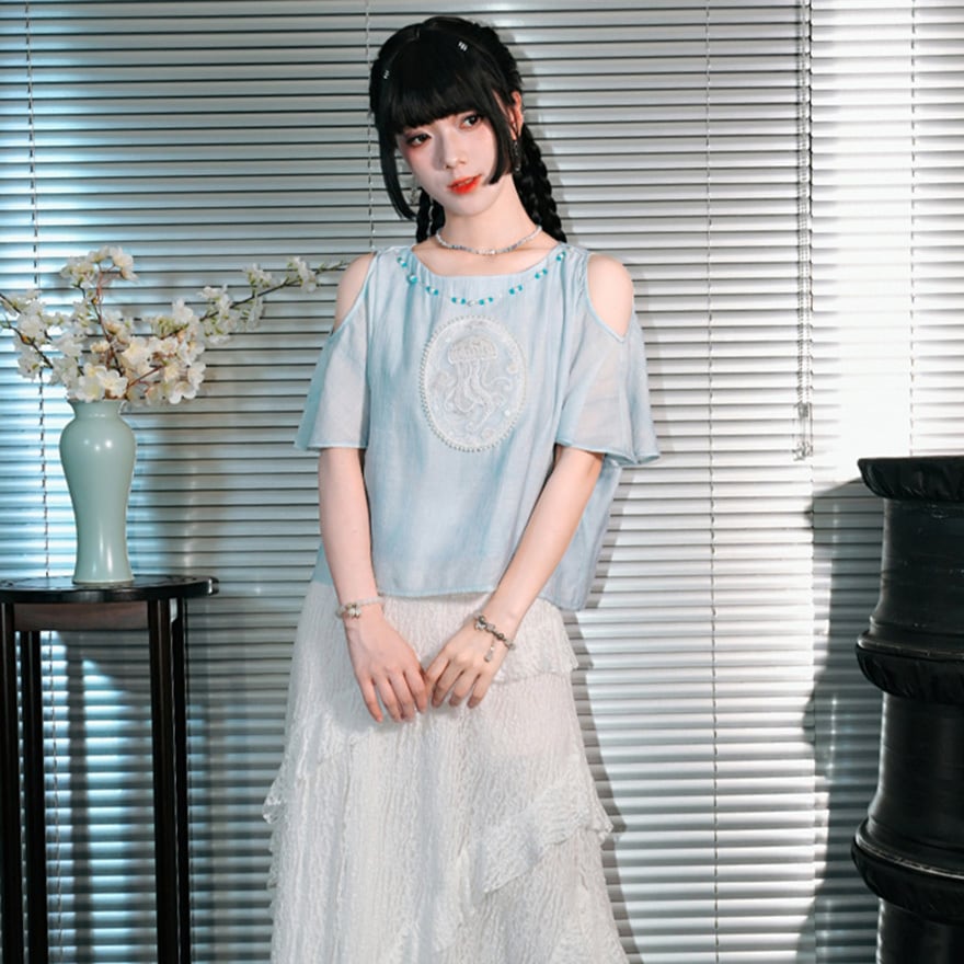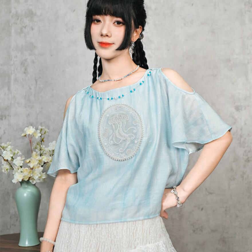 関連キーワード: #チャイナ風 #中華服 #中華系ファッション #サブカル #地雷系 #シャツ #トップス #オープンショルダー #肩見せ #刺繍 #海月 #クラゲ #フェイクパール #ビーズ #水色 #夏服 #古怪舎