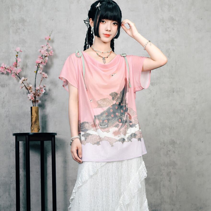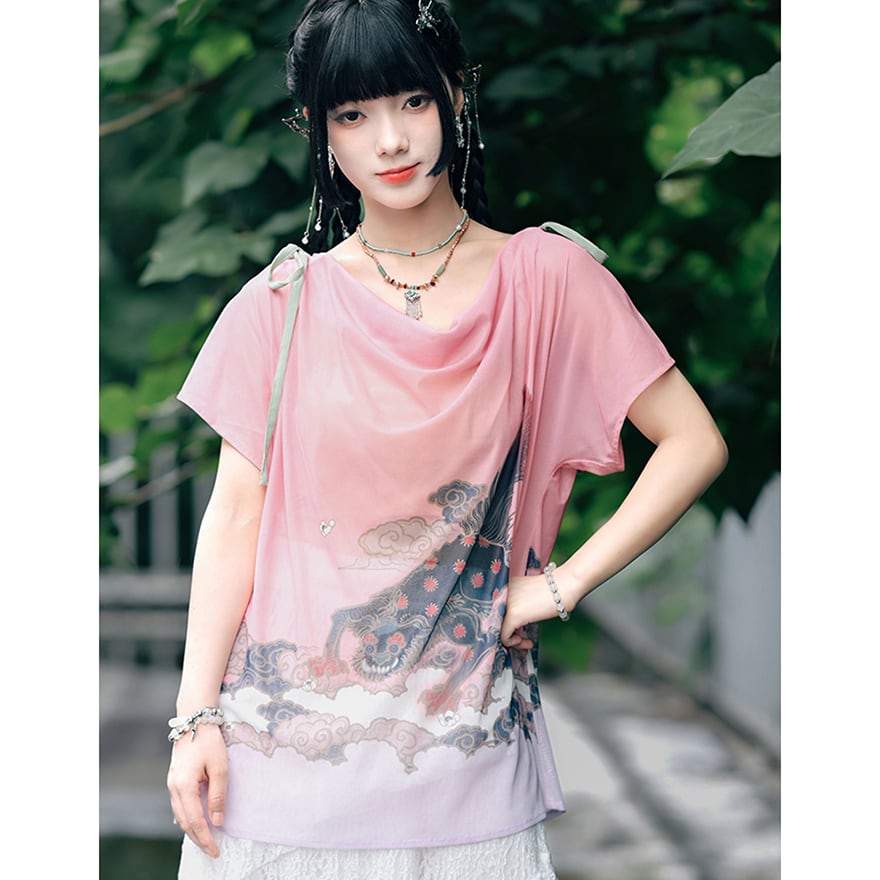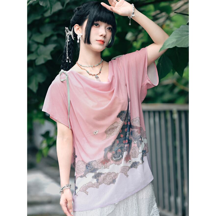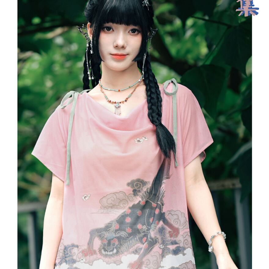 関連キーワード: #チャイナ風 #中華服 #中華系ファッション #サブカル #地雷系 #トップス #シャツ #メッシュ #シアー #プリント #神獣 #ピンク #夏服 #レイヤード #ドレープ #ゆったり #古怪舎 #バックシャン