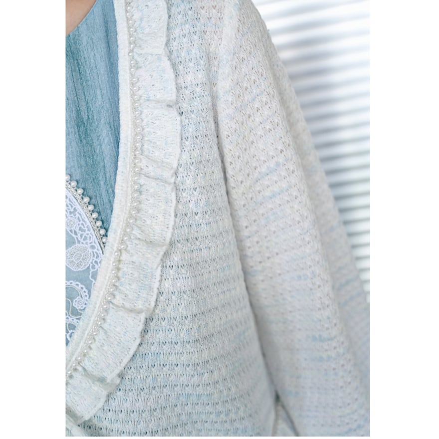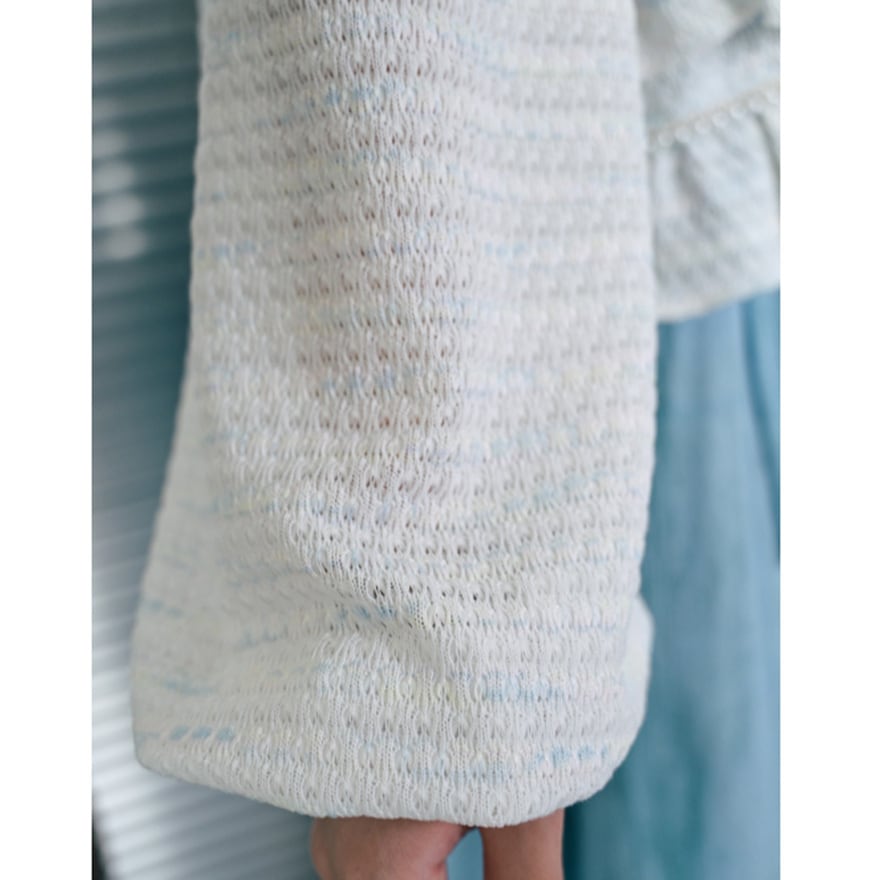 オフホワイトの生地に、ポコポコとした凹凸のある質感が可愛らしい長袖カーディガンです。
