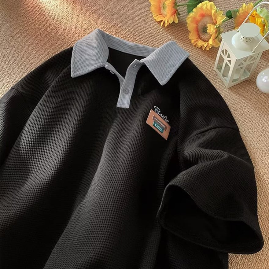凹凸のあるワッフル生地が特徴的な、半袖ポロシャツです。
