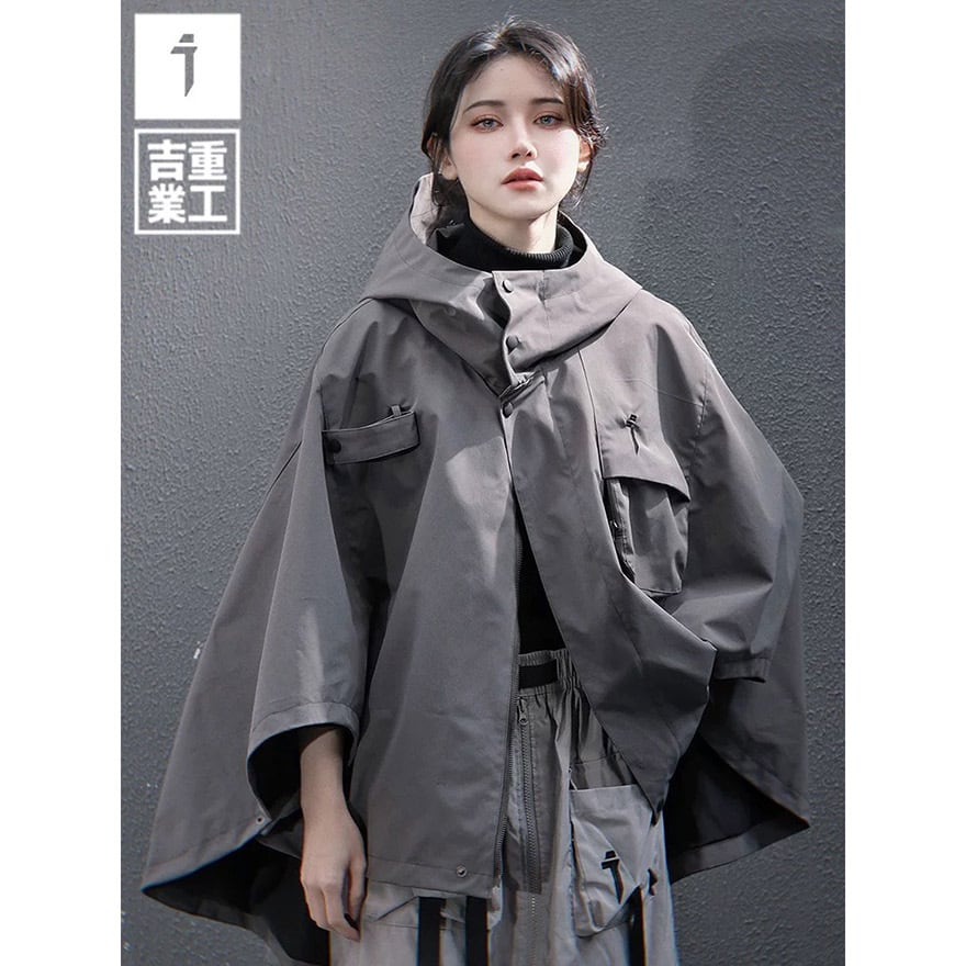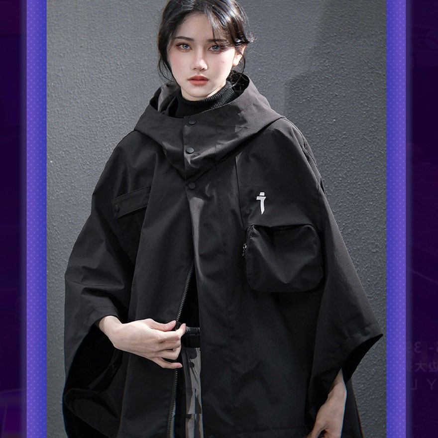 ポンチョのような独特のシルエットが目を引く、サイバーパンク風のフーデッドジャケットです。