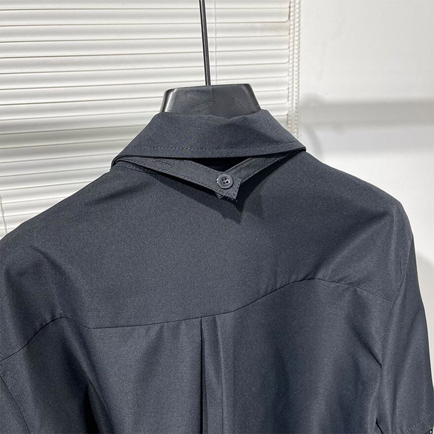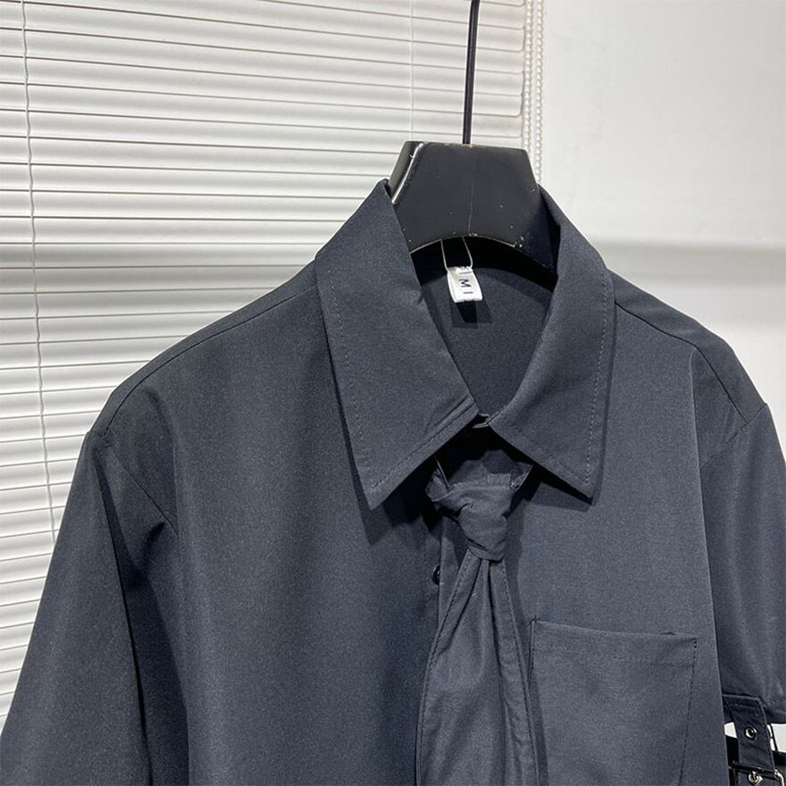半袖シャツに、バックル付きストラップで固定する長袖パーツがドッキングした、独創的なデザインシャツです。