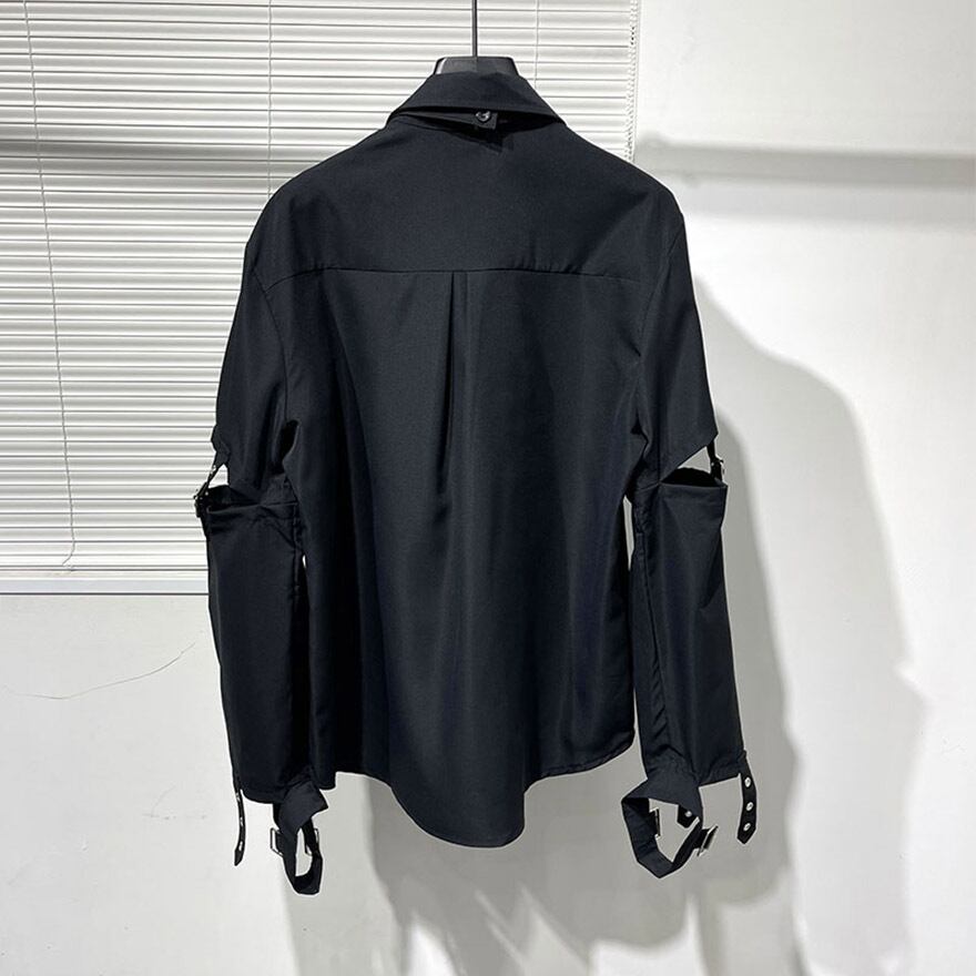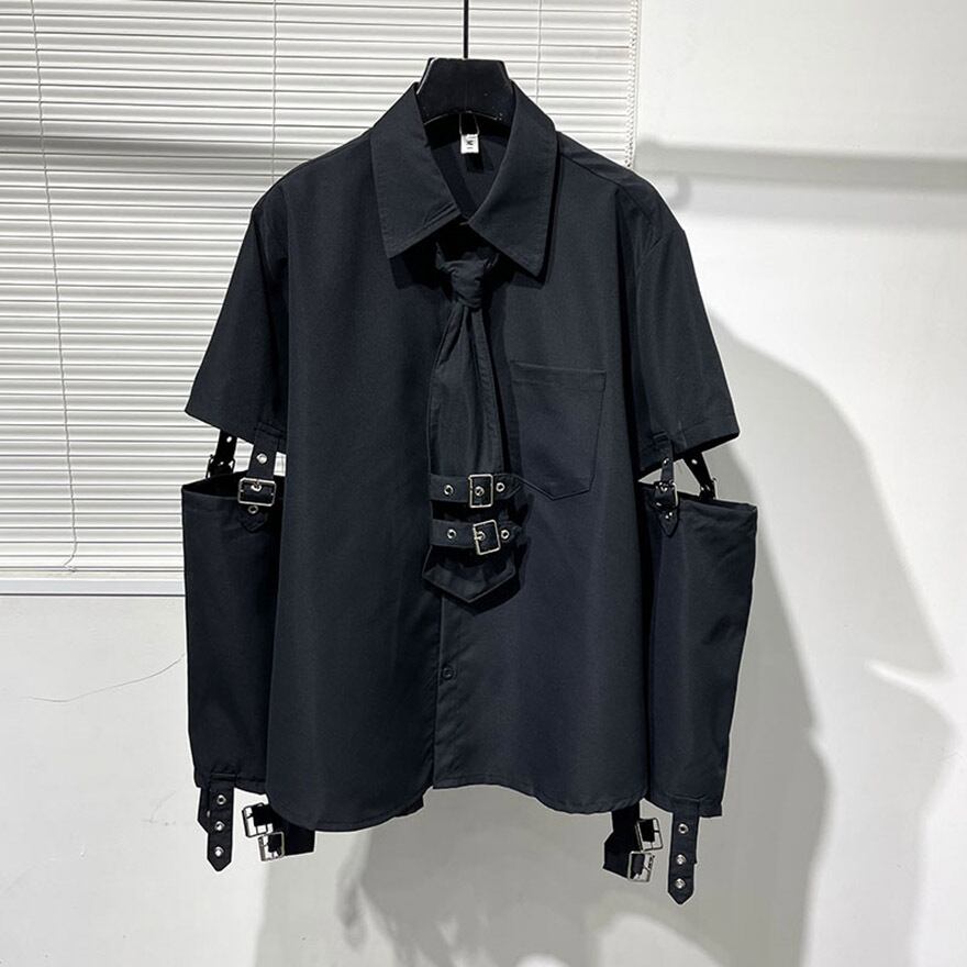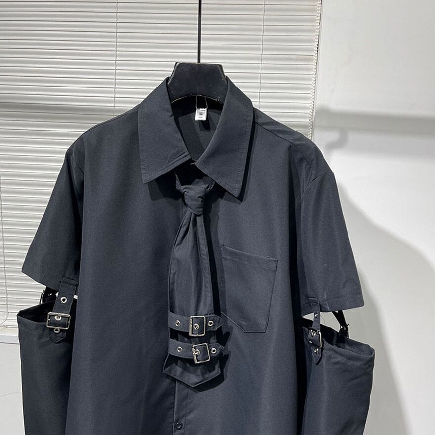 肩のカットアウトと、胸元から垂れるネクタイ風のデザインにあしらわれたメタルバックルが、ハードでサイバーな印象を際立たせます。