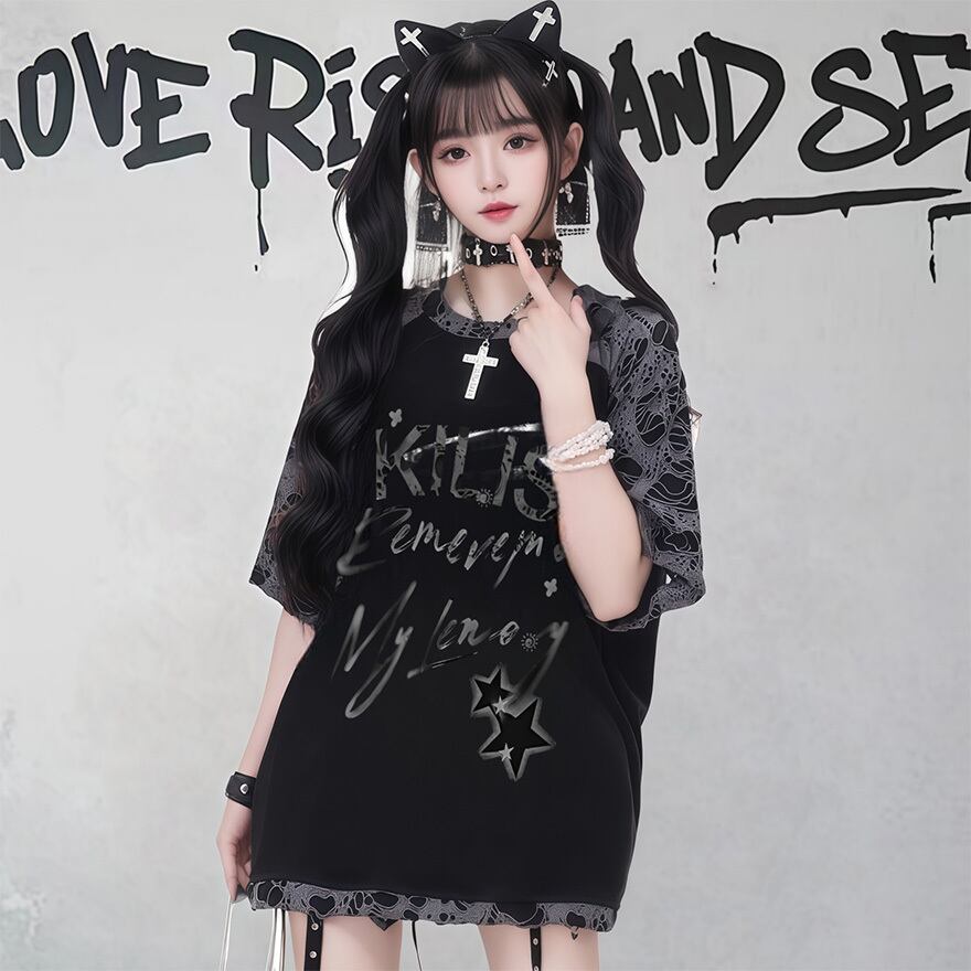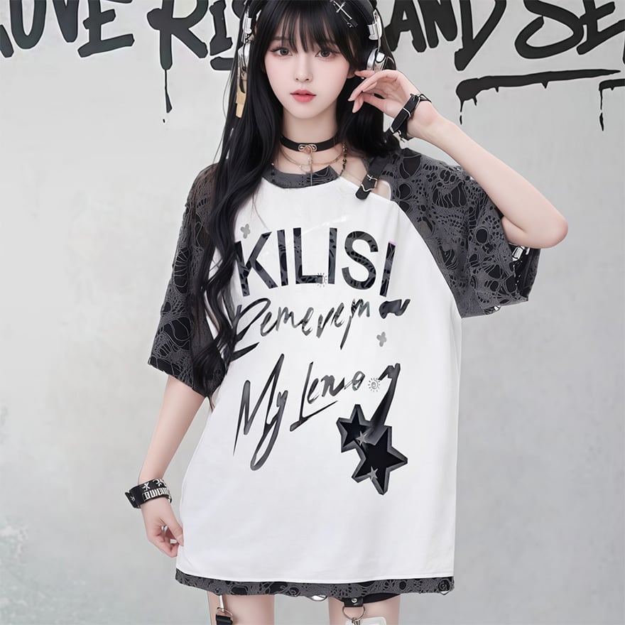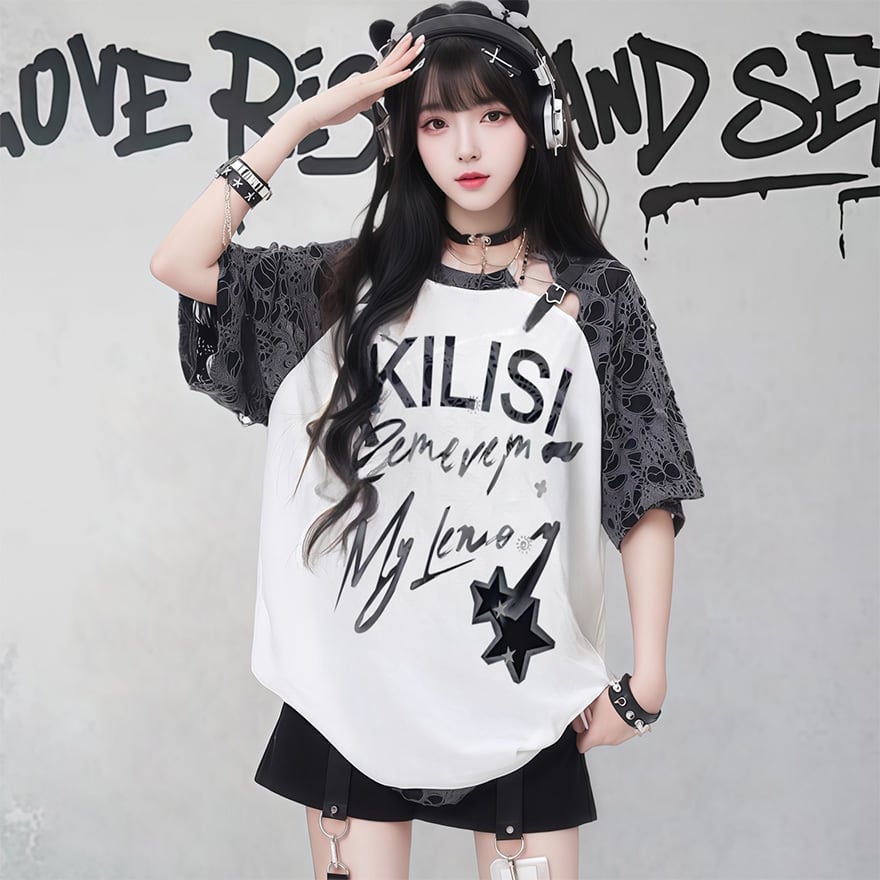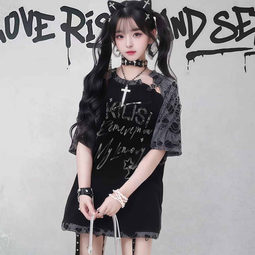 関連キーワード: #サブカル #地雷系 #Y2K #ストリートファッション #パンク #ロック #ゴシック #半袖Tシャツ #オーバーサイズ #肩あき #肌見せ #病みかわ #天使界隈 #V系