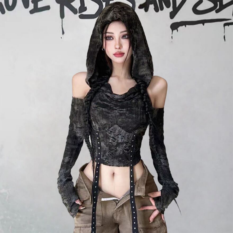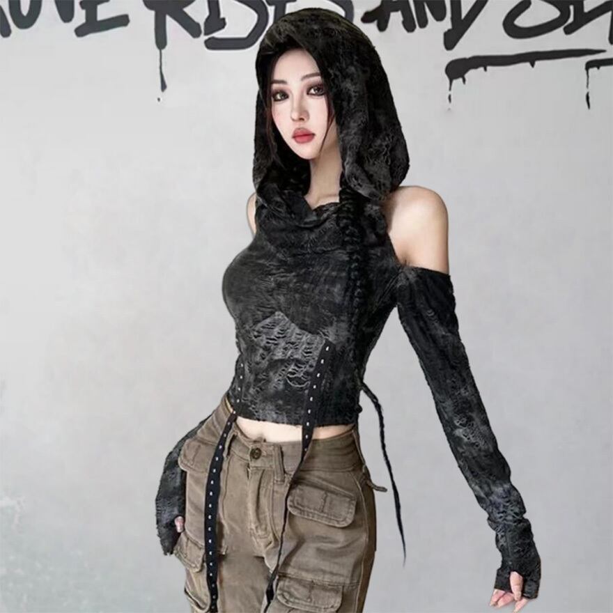 関連キーワード: #サブカル #地雷系 #Y2K #グランジ #ゴシック #サイバーパンク #フェアリーグランジ #長袖 #クロップド丈 #パーカー #フード #肩あき #オープンショルダー #肌見せ #病みかわ #ストリートファッション