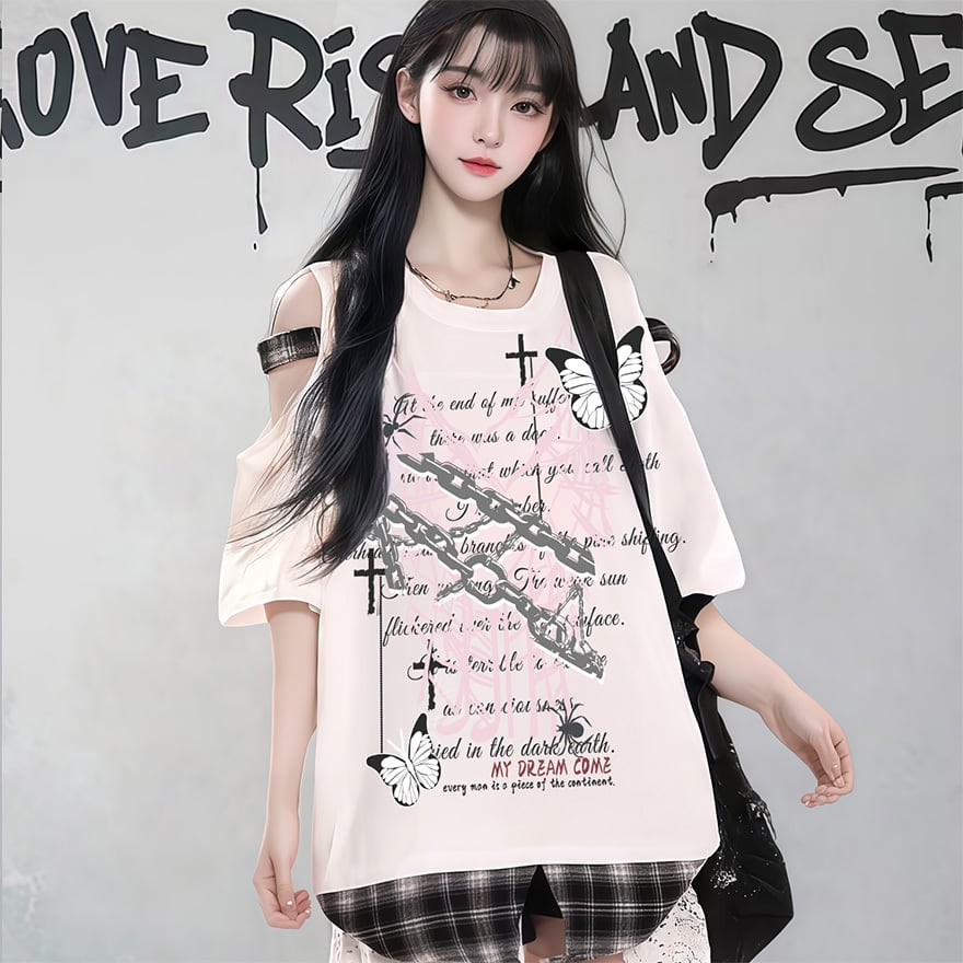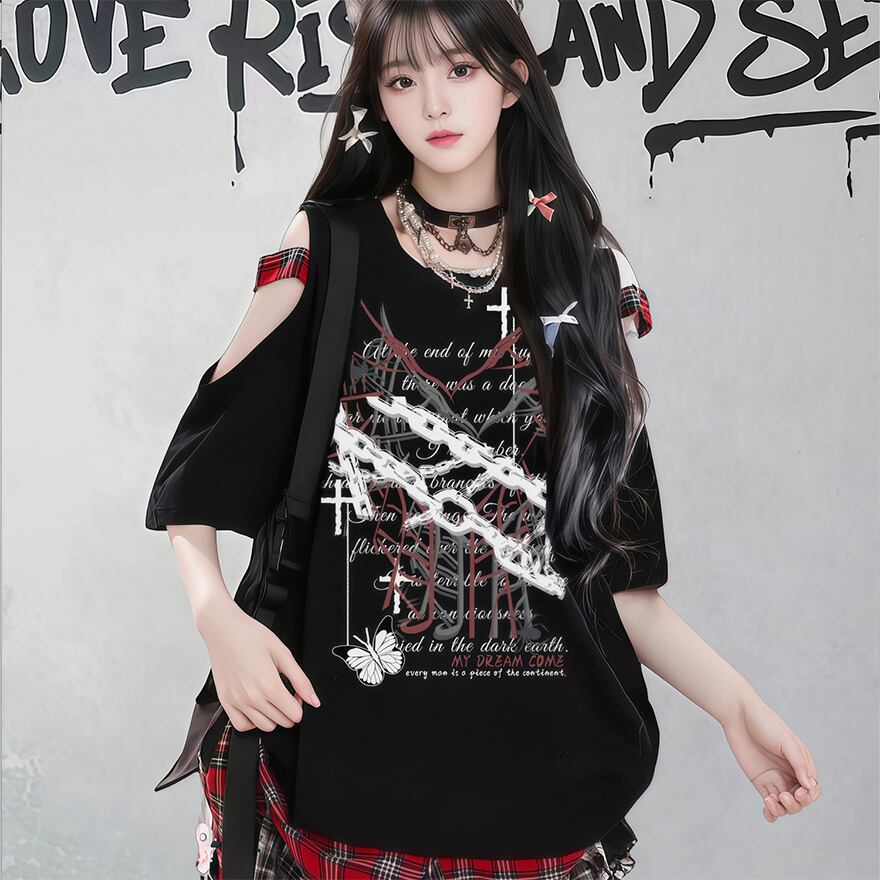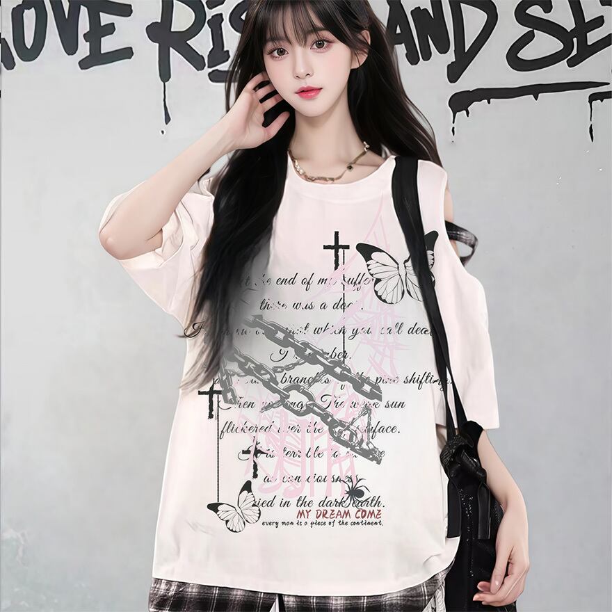 関連キーワード: #サブカル #地雷系 #Y2K #ストリートファッション #ゴシック #パンク #半袖Tシャツ #オーバーサイズ #肩あき #オープンショルダー #十字架 #蝶 #病みかわ #天使界隈 #グランジ