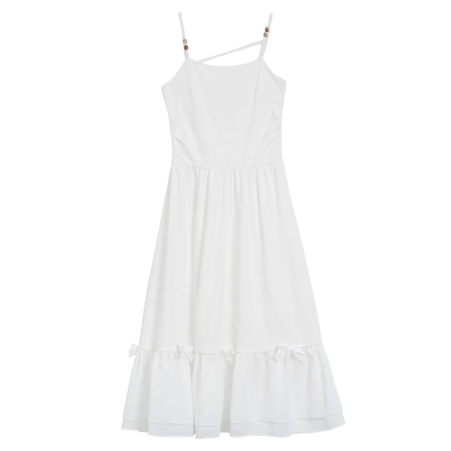 アシンメトリーなストラップが目を引く、ピュアホワイトのキャミソールワンピースです。