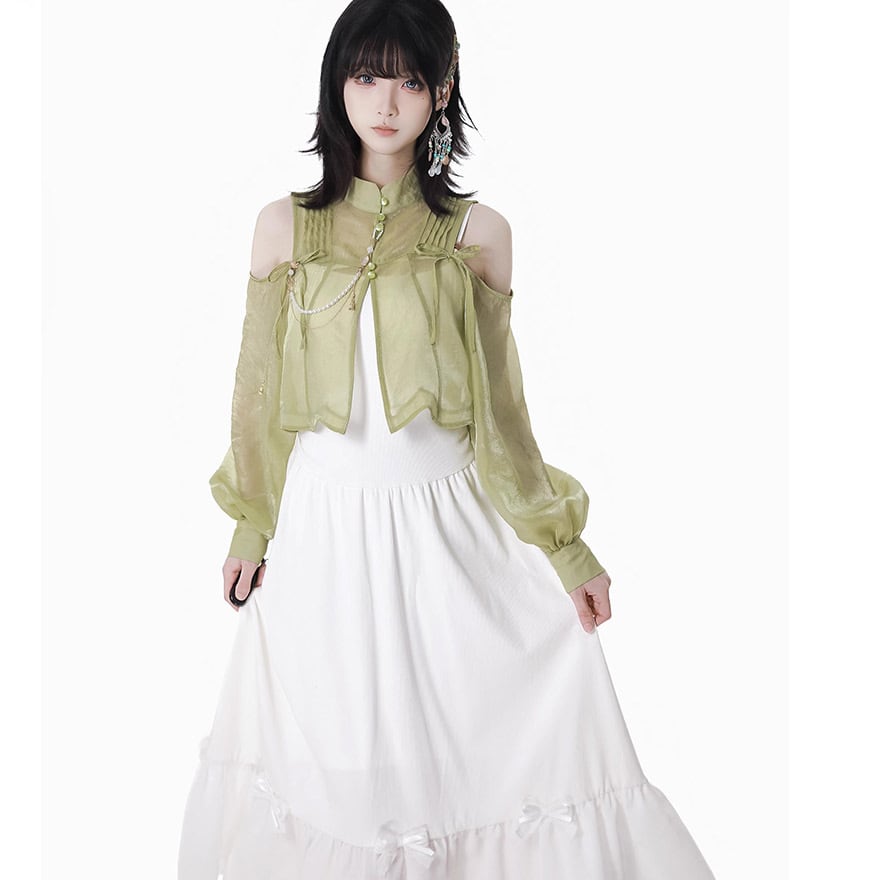 関連キーワード: #サブカル #地雷系 #Y2K #中華風 #華ロリ #オープンショルダー #シアーシャツ #ボレロ #クロップド丈 #ショート丈 #個性的 #妖精コーデ #儚い系 #パール #ランタンスリーブ