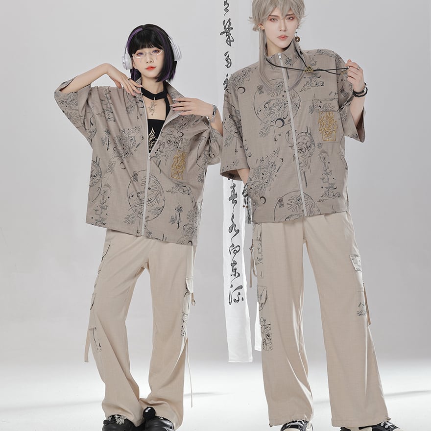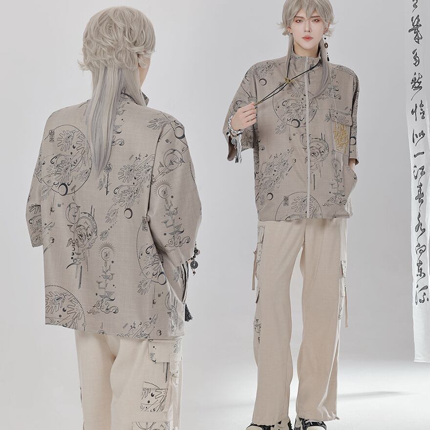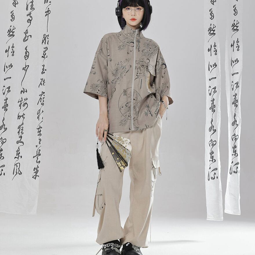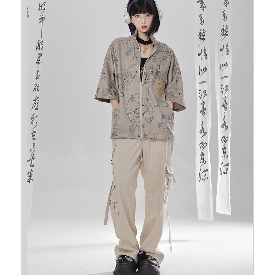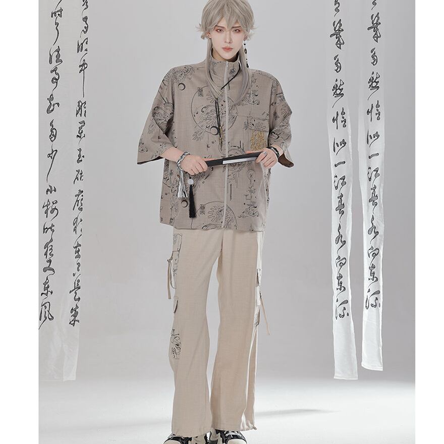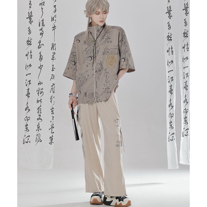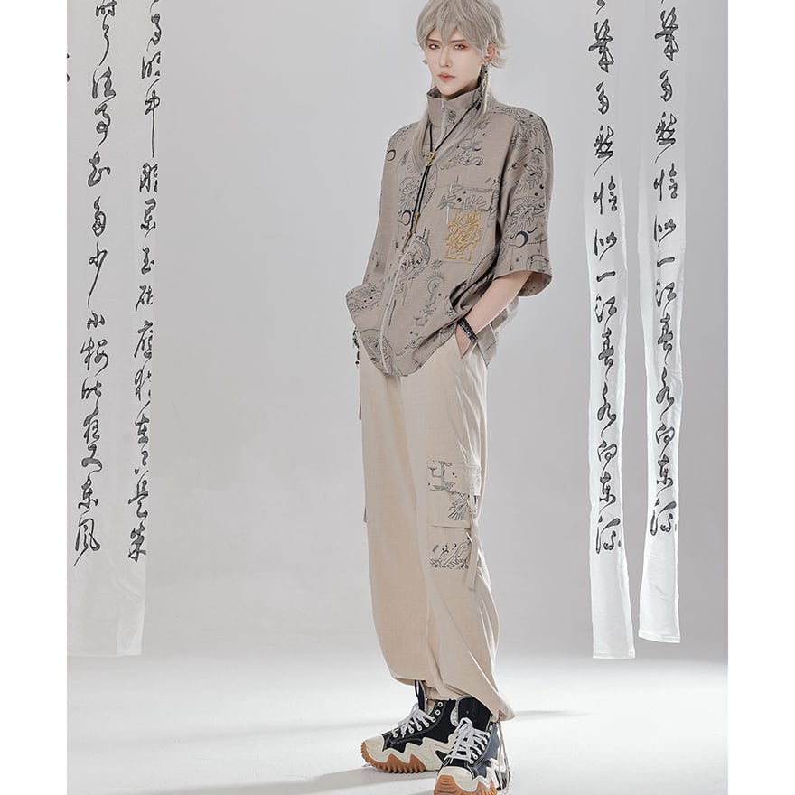 関連キーワード: #チャイナ風 #中華服 #カーゴパンツ #ワイドパンツ #ジョガーパンツ #2WAY #ストリートファッション #Y2K #サブカル #プリント #ユニセックス #男女兼用 #卿棠 #個性的 #ベージュ #セットアップ