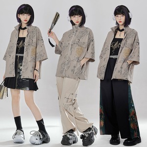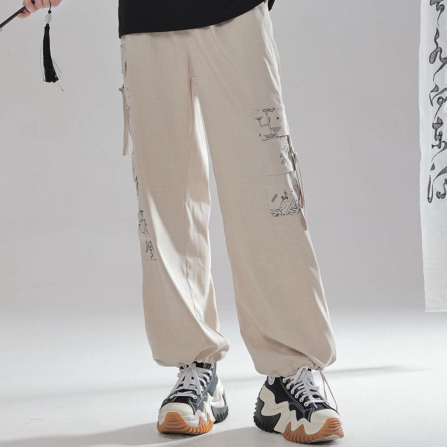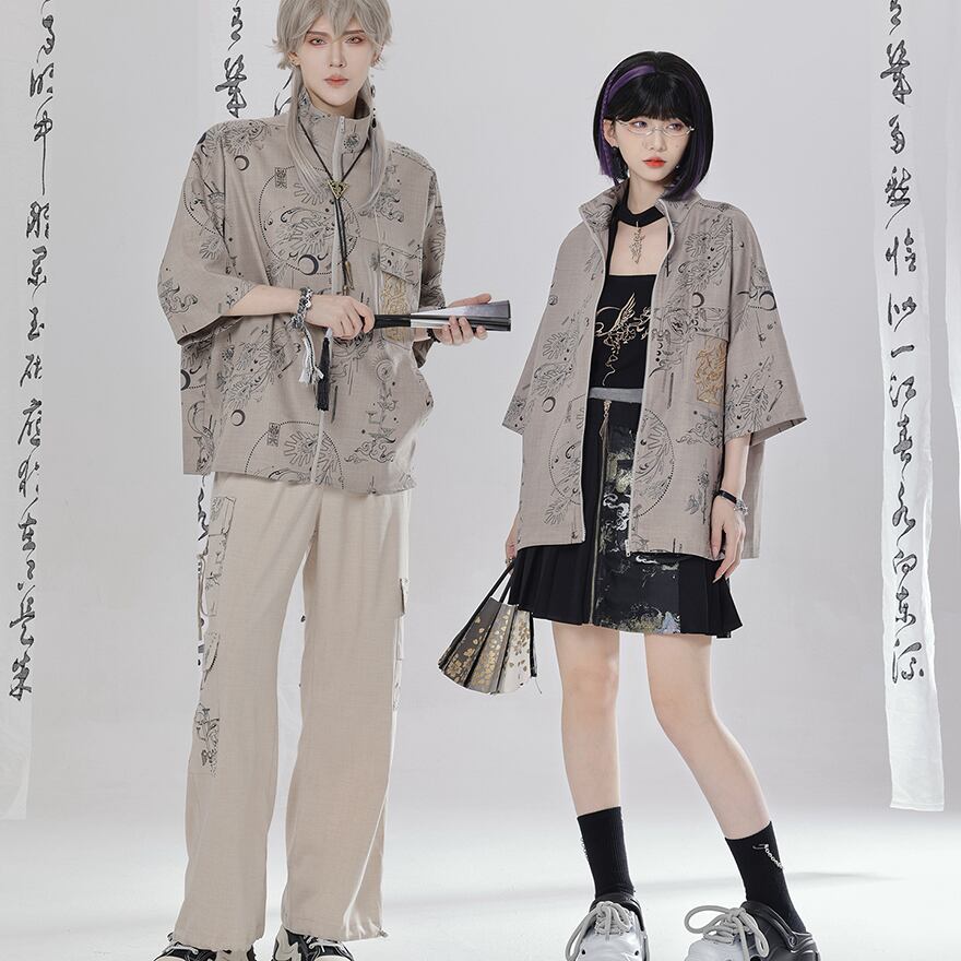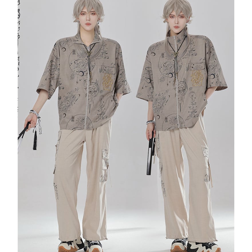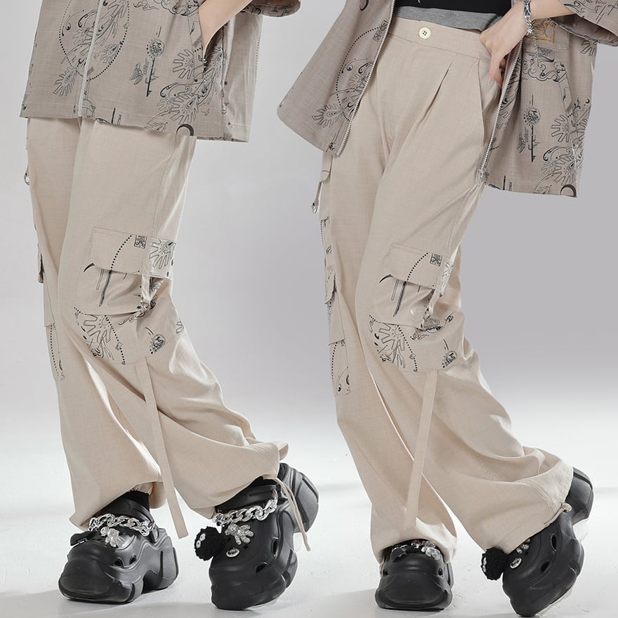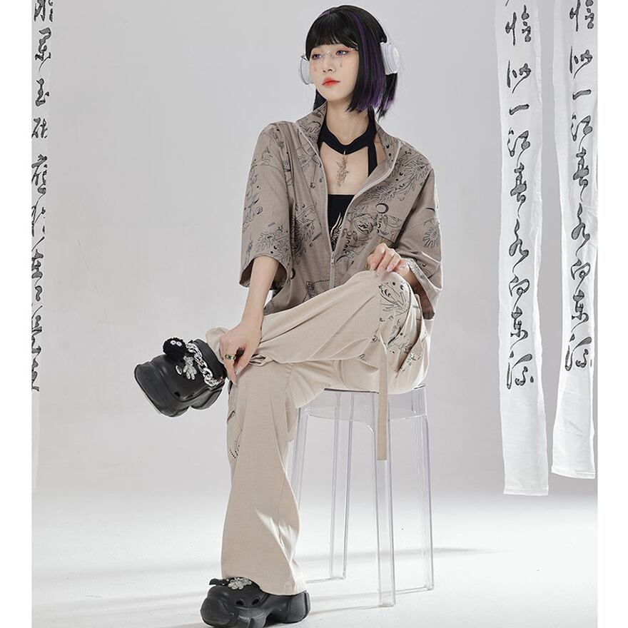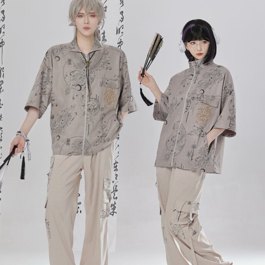 関連キーワード: #チャイナ風 #中華服 #カーゴパンツ #ワイドパンツ #ジョガーパンツ #2WAY #ストリートファッション #Y2K #サブカル #プリント #ユニセックス #男女兼用 #卿棠 #個性的 #ベージュ #セットアップ