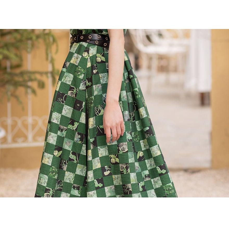 深みのあるグリーンを基調とした、クラシカルな市松模様のロングジレです。