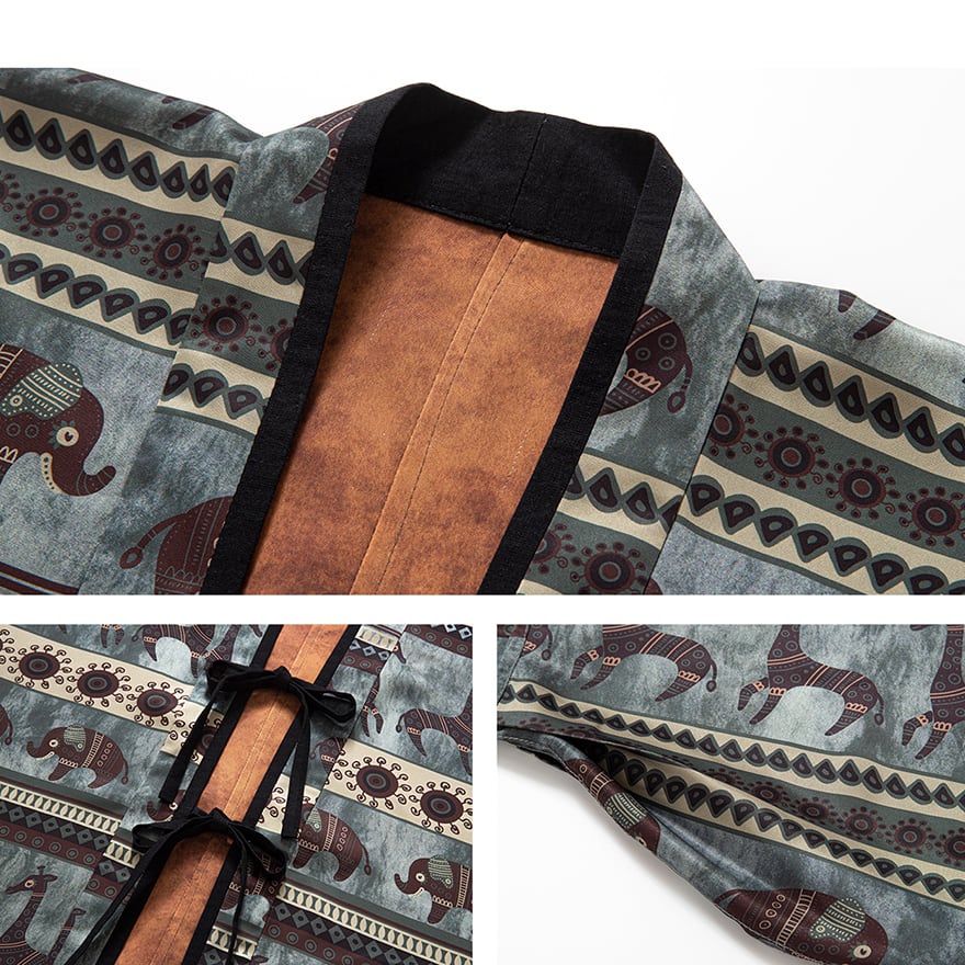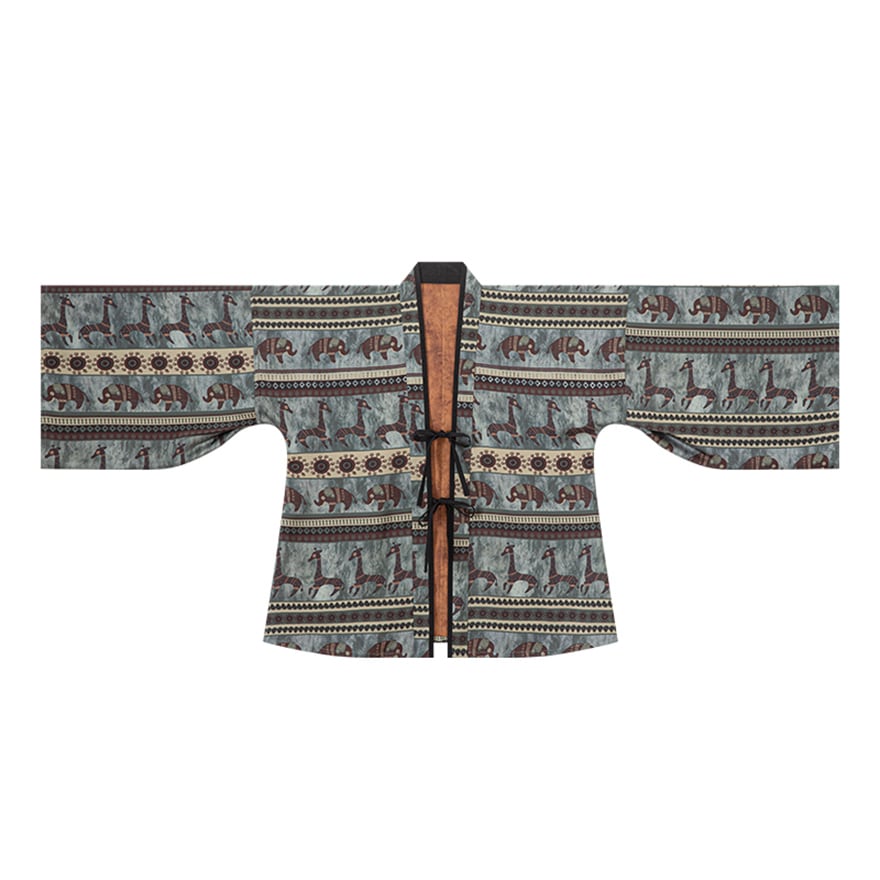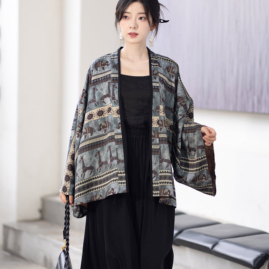 片面は、象やキリンなどの動物をモチーフにした、古代の壁画を思わせるエスニックな総柄プリント。