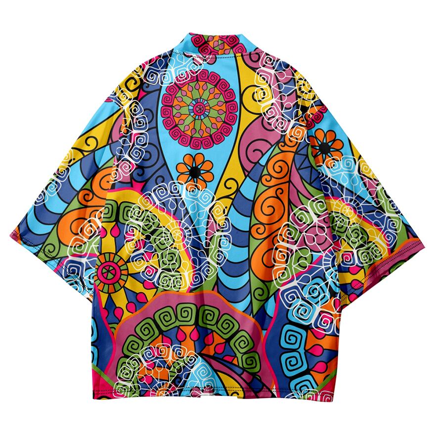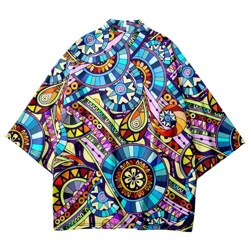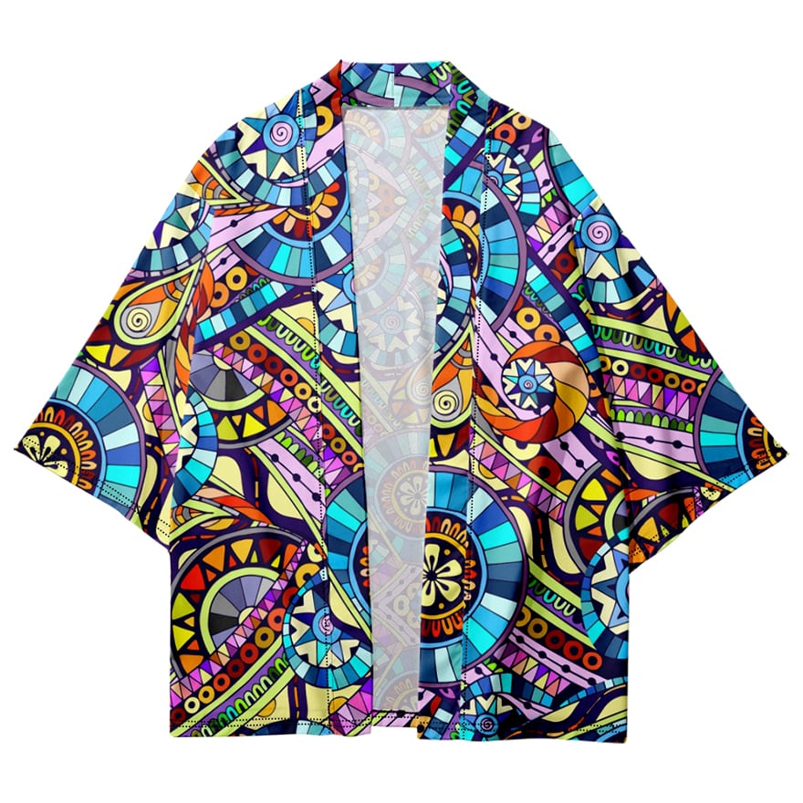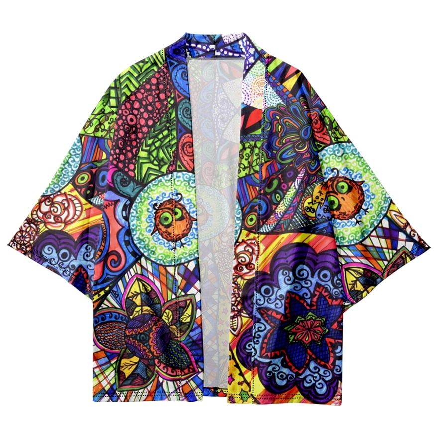万華鏡を覗き込んだような、サイケデリックでアーティスティックな総柄が目を惹く羽織りです。