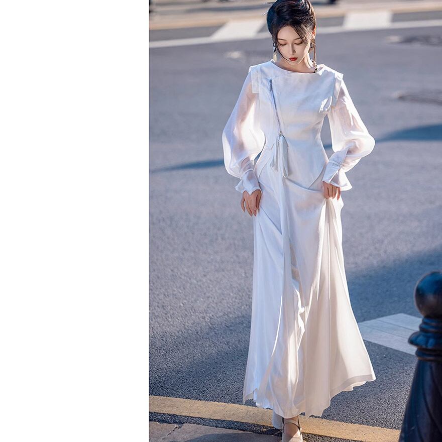 裾や襟元は左右非対称にデザインされ、見る角度によって表情が変わる独創的なシルエットが特徴。