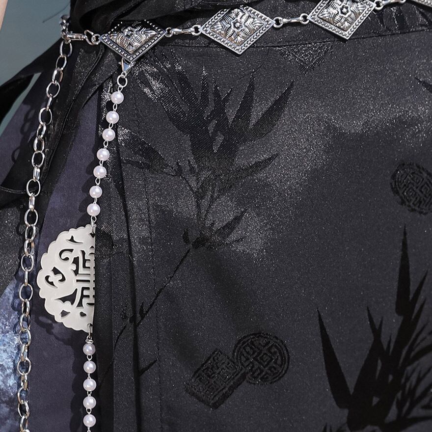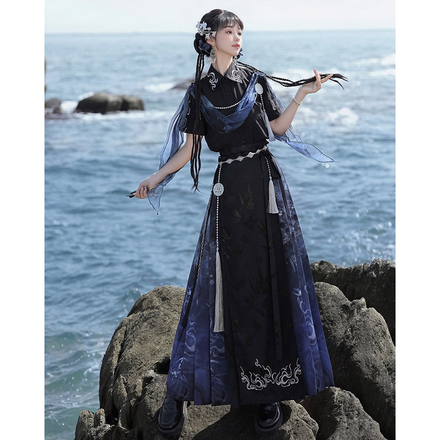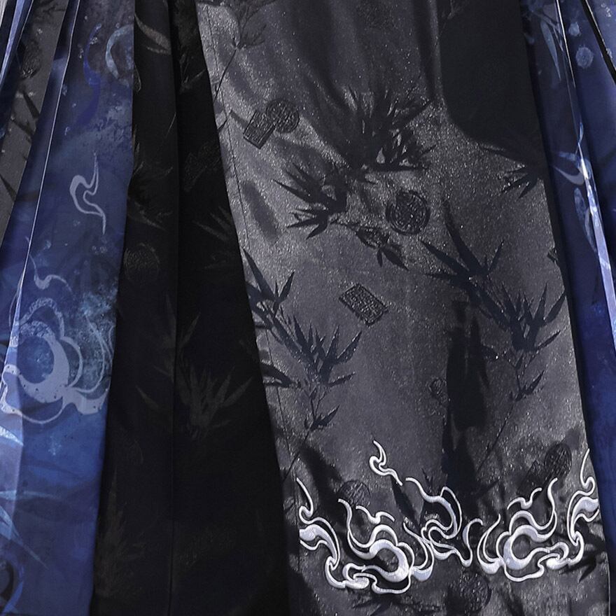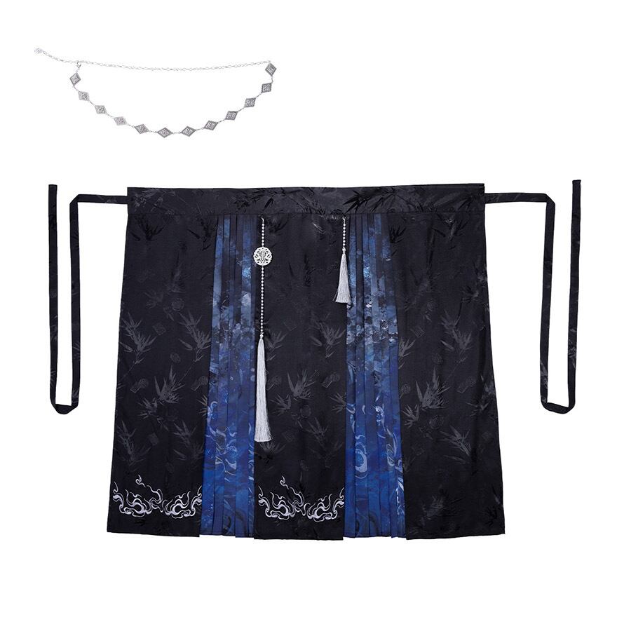 漆黒のジャカード生地をベースに、中央には深海を思わせる青のグラデーションプリントが施されたプリーツ生地を配置。裾には白い雲のような繊細な刺繍、揺れるタッセル飾りが幻想的な雰囲気を高めます。セットのチェーンベルトが、コーディネートをさらに引き締めます。