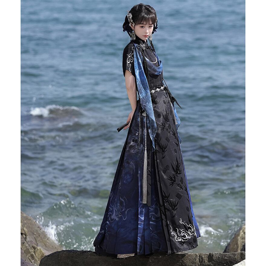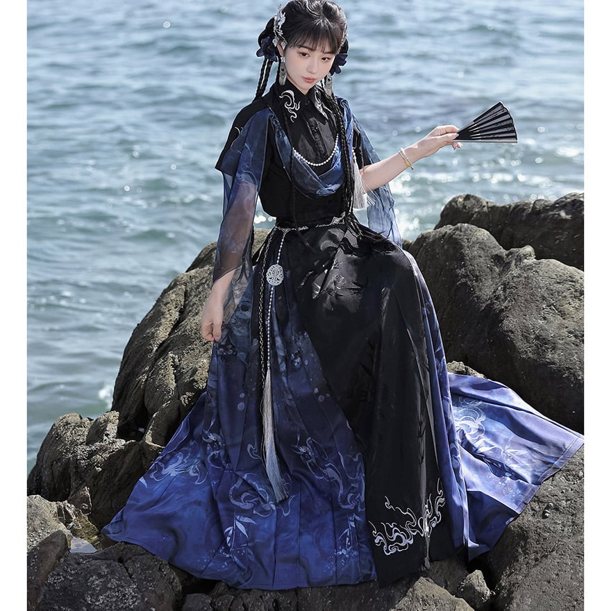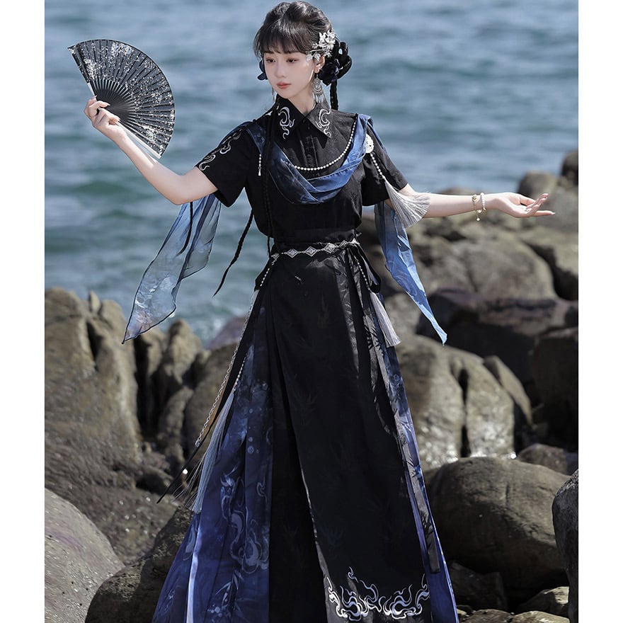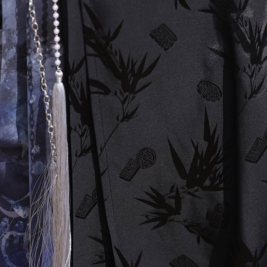 漆黒のジャカード生地をベースに、中央には深海を思わせる青のグラデーションプリントが施されたプリーツ生地を配置。裾には白い雲のような繊細な刺繍、揺れるタッセル飾りが幻想的な雰囲気を高めます。セットのチェーンベルトが、コーディネートをさらに引き締めます。