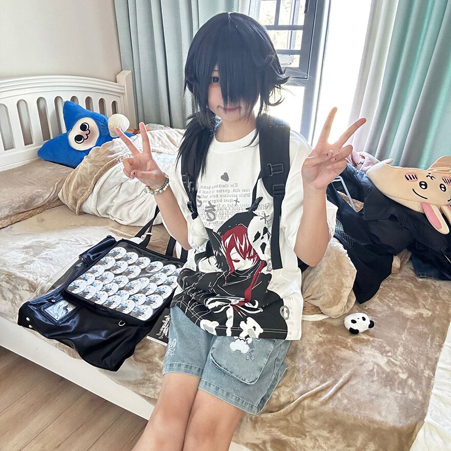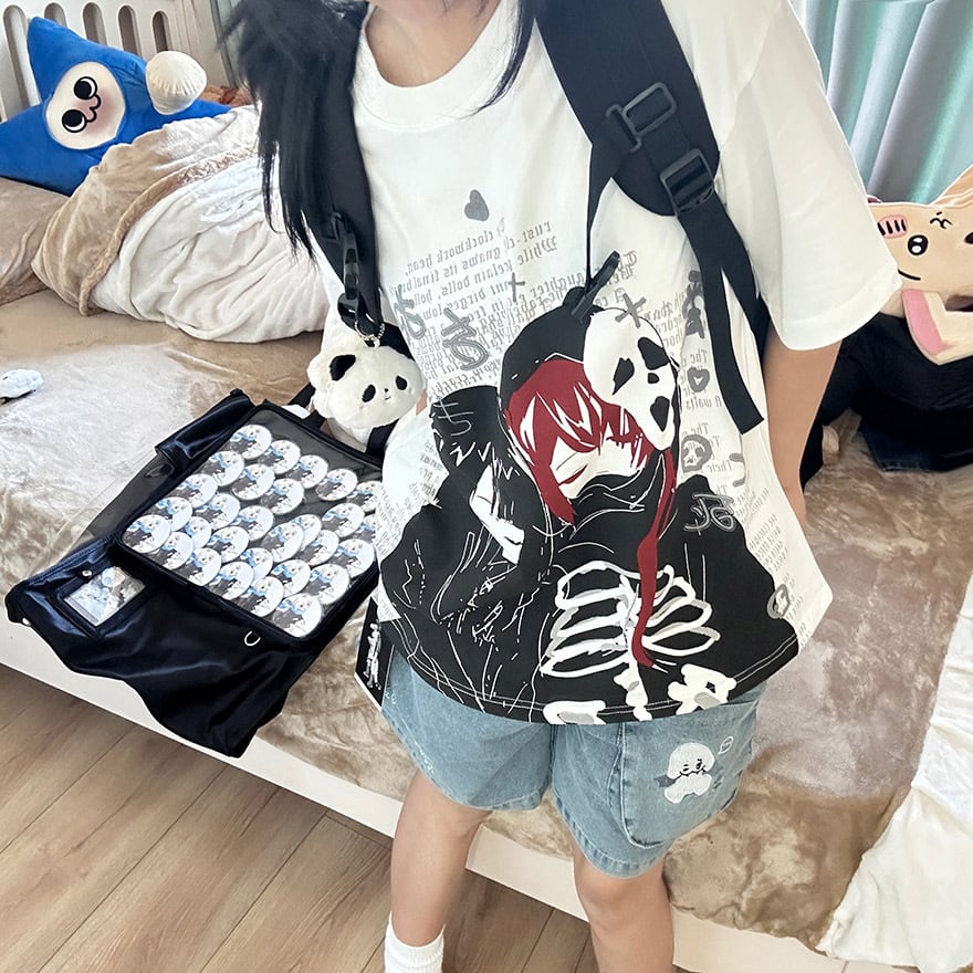 キャラクターの背景には英字や漢字のゴシック風ロゴが散りばめられ、独特の雰囲気を醸し出しています。ゆったりとしたオーバーサイズで、男女問わず着用できるユニセックスなアイテムです。