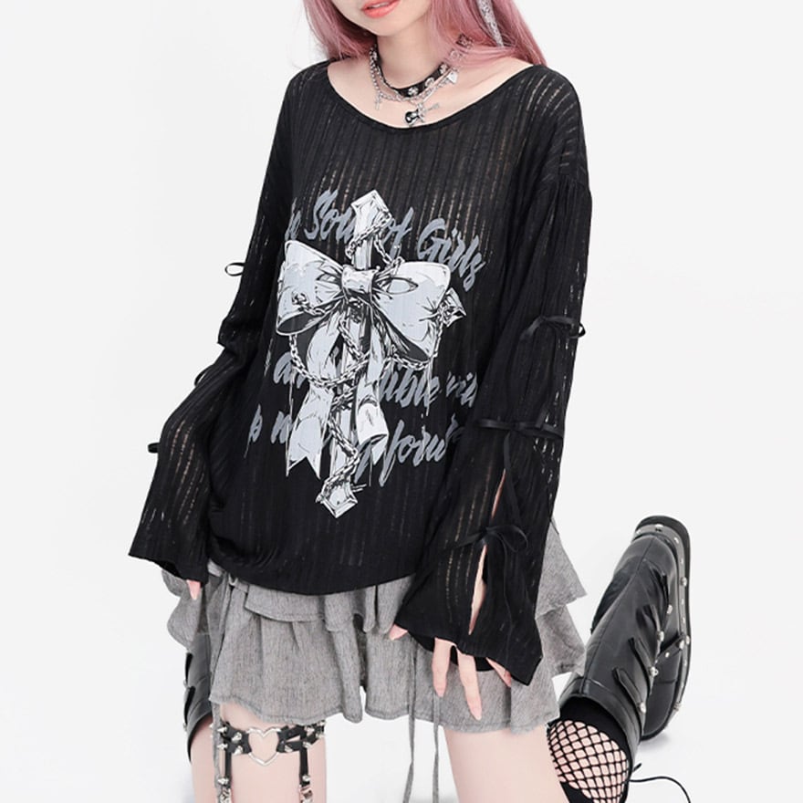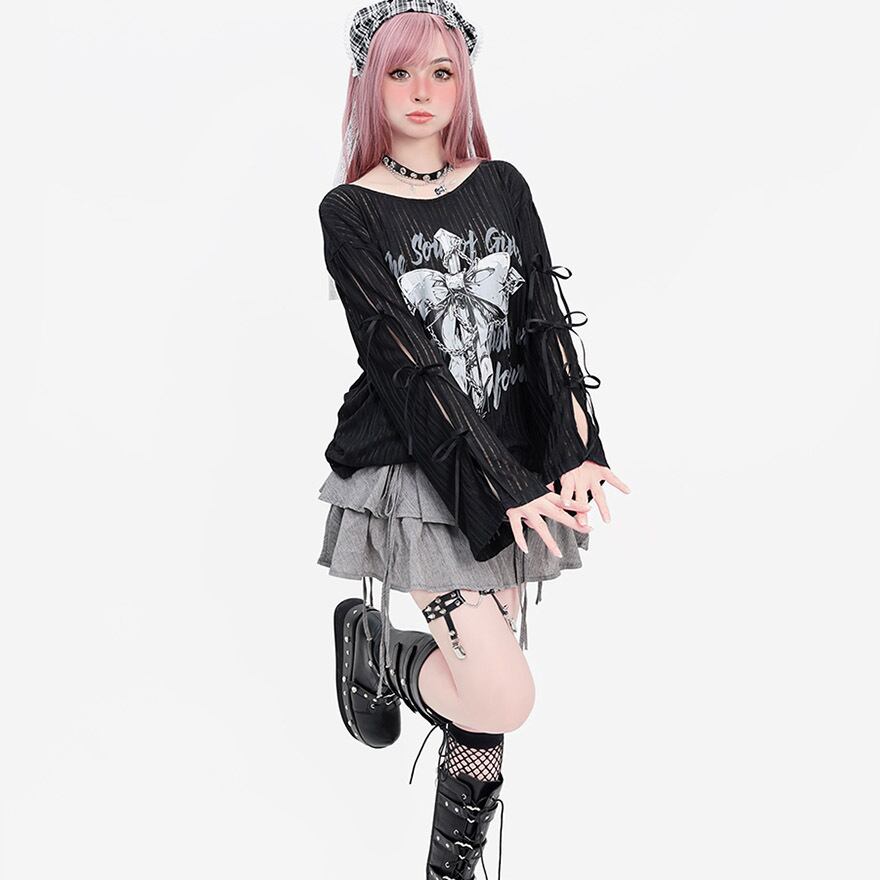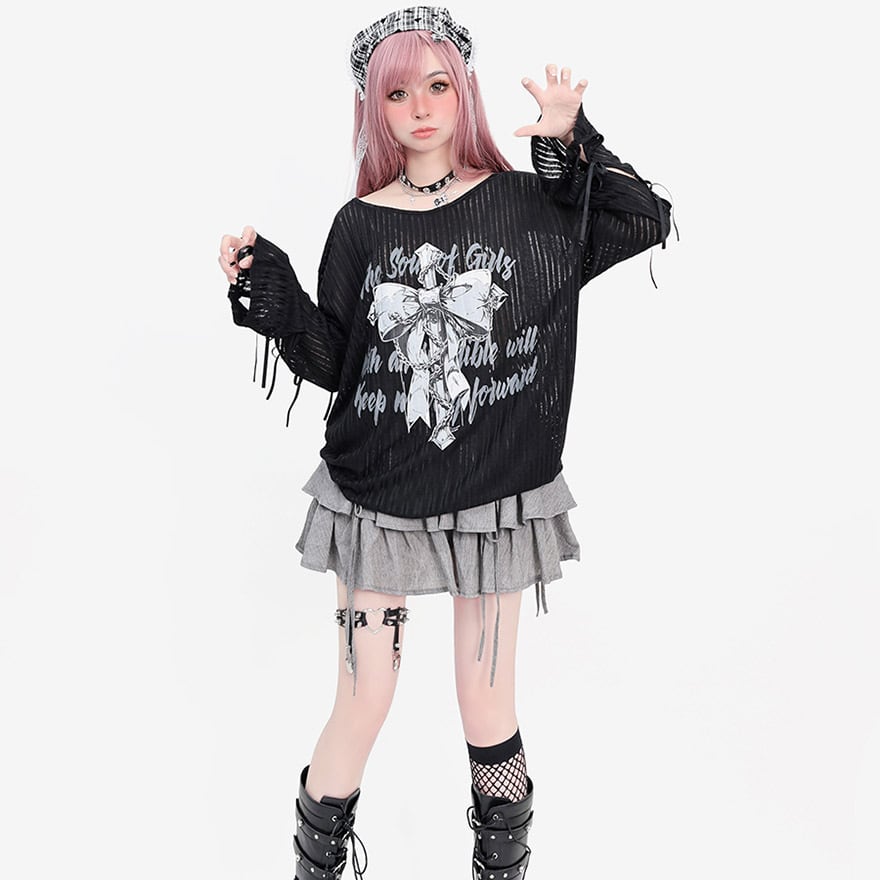 ガーリーなリボンプリントと、退廃的なクラッシュ加工の組み合わせが「甘辛MIX」な地雷系スタイルを一枚で完成させてくれます。