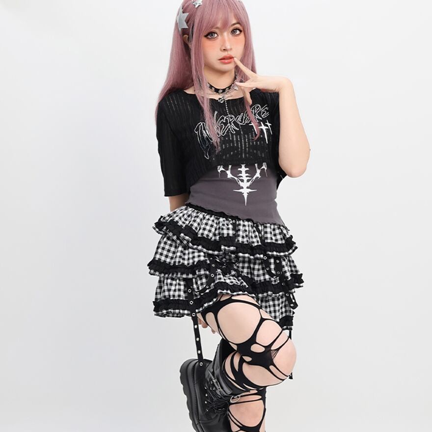 ゴシックなロゴがプリントされたメッシュ素材のクロップドTシャツと、骨をモチーフにしたハートグラフィックが印象的なホルターネックキャミソールのセットアップです。