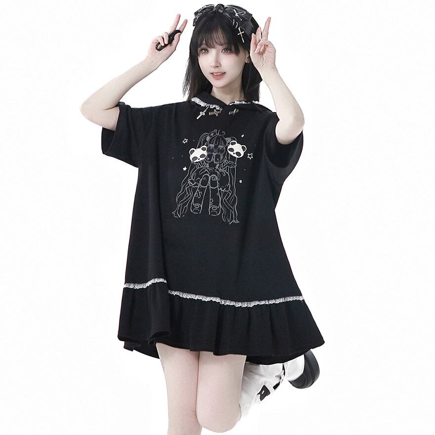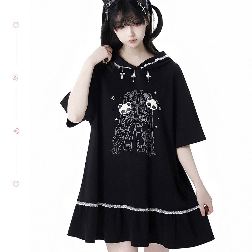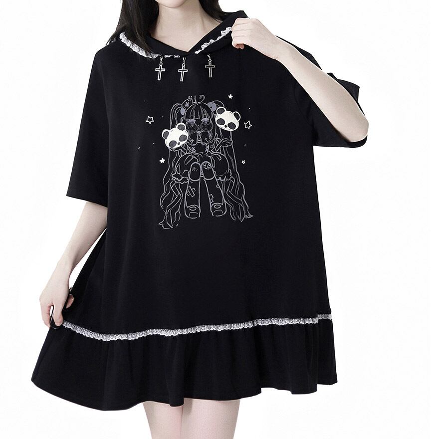 闇かわいい女の子とパンダのイラストがフロントにプリントされた、フード付きの半袖ワンピースです。