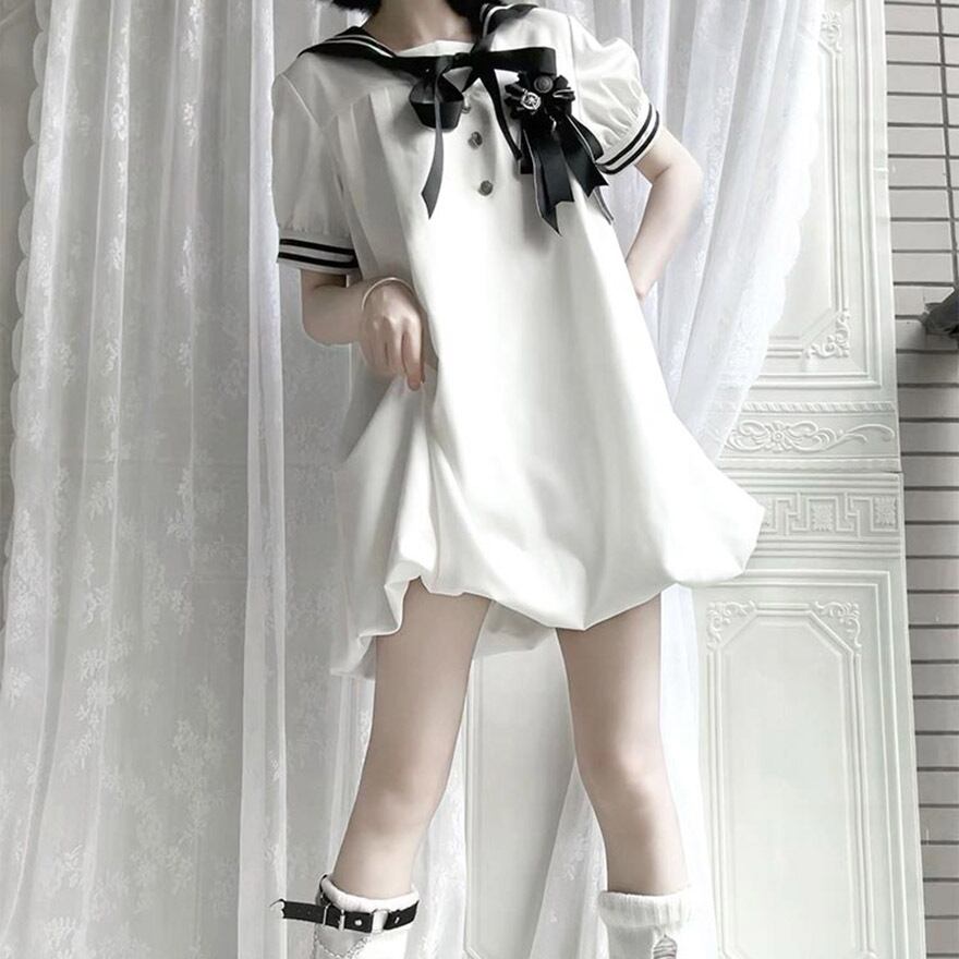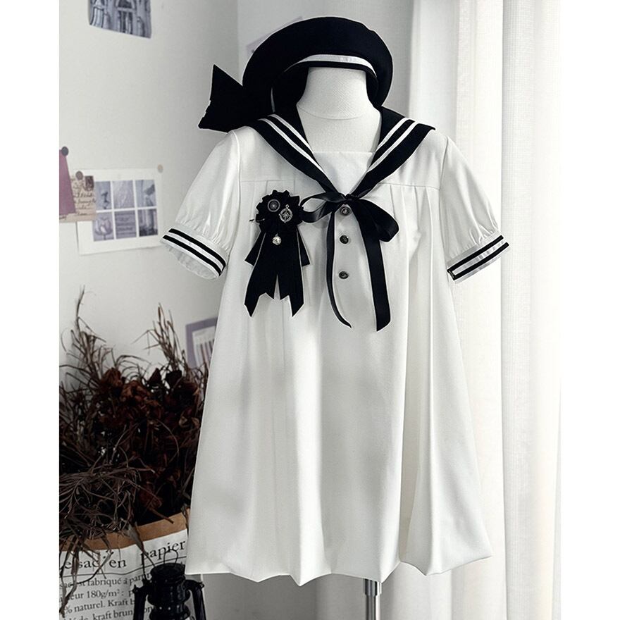 ホワイトの生地に、ブラックのセーラーカラーが映える、少年装スタイルのワンピースです。