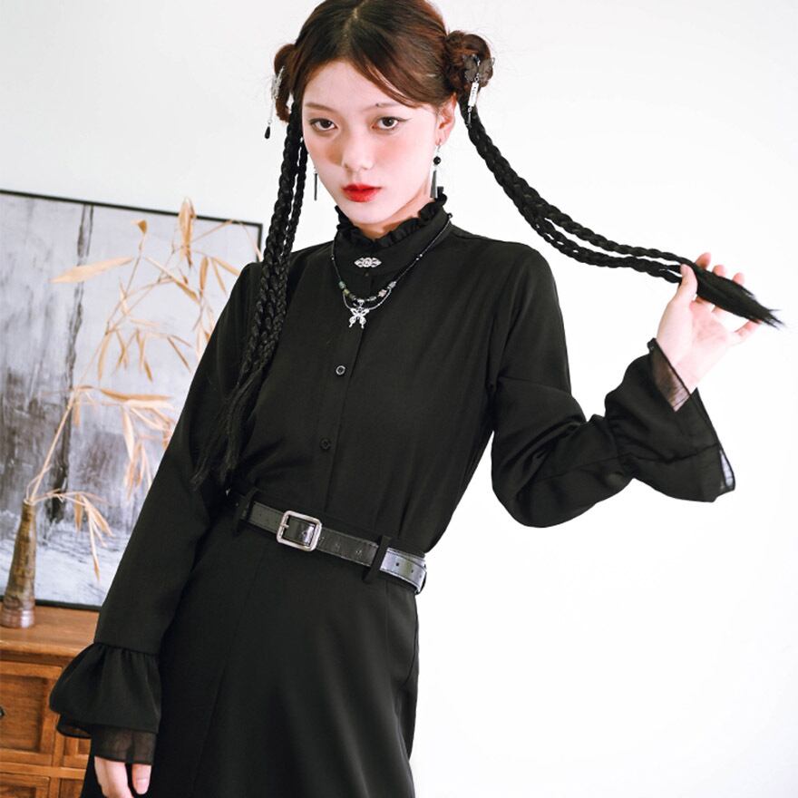 関連キーワード: #チャイナ #中華風 #チャイナシャツ #サブカル #モード #ゴシック #地雷系 #ブラウス #長袖 #スタンドカラー #フリル #袖コンシャス #シアー #ベルスリーブ #個性的 #黒 #白 #参戦服