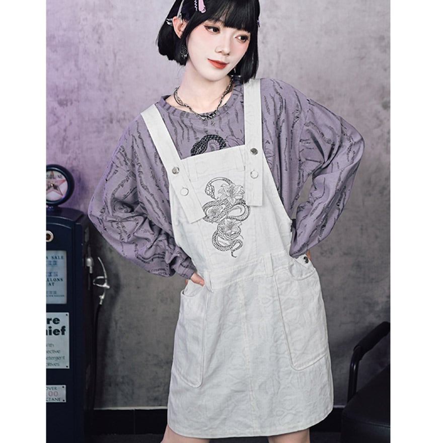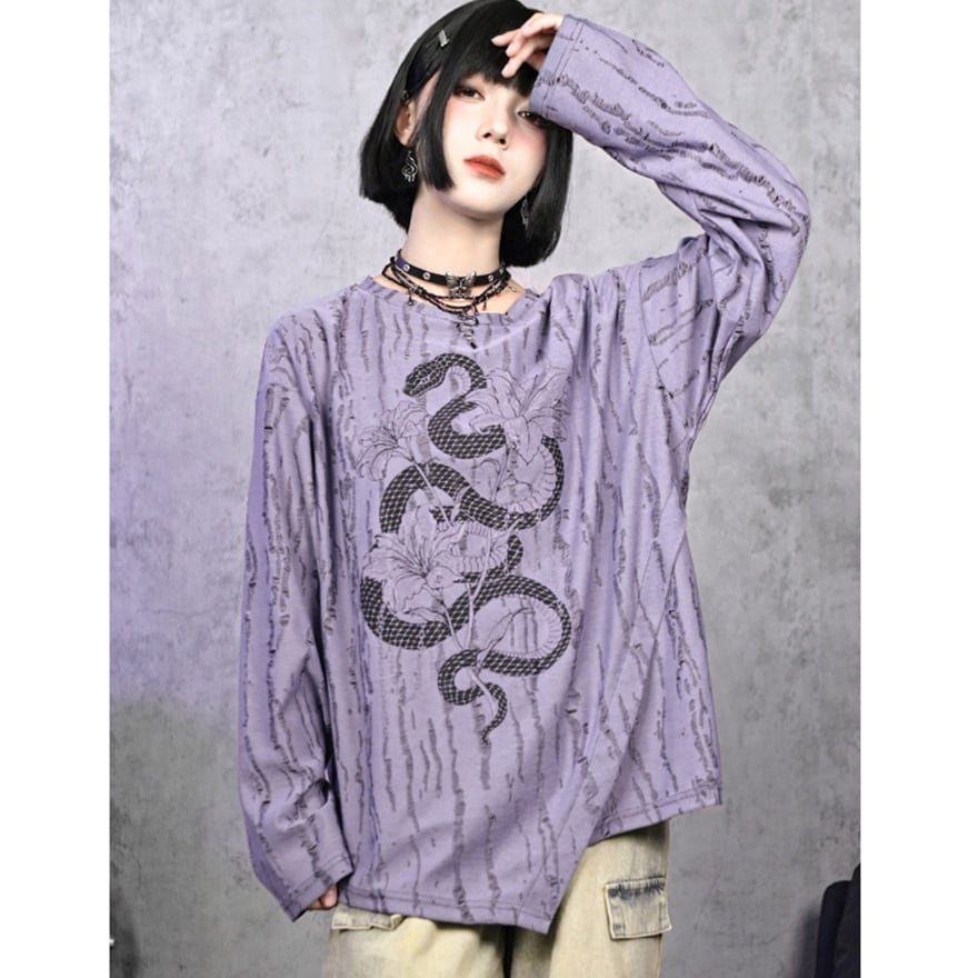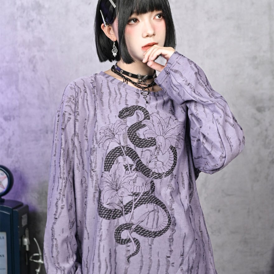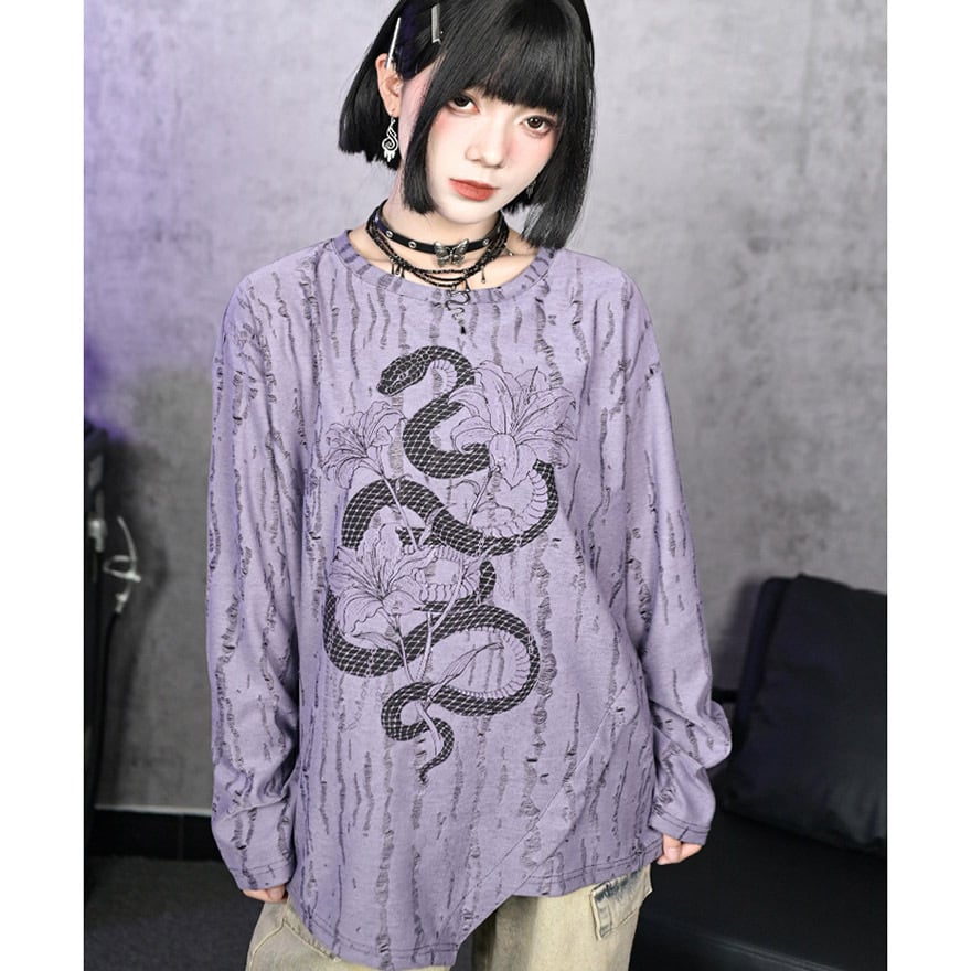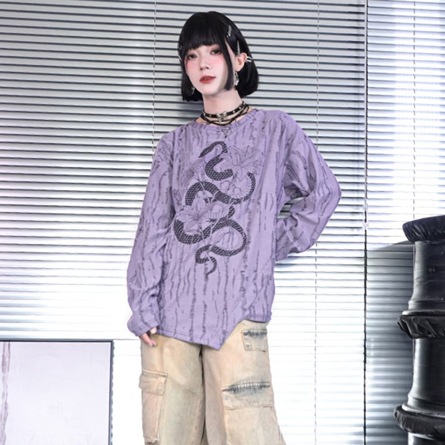 関連キーワード: #チャイナ #中華風 #サブカル #ストリート #グランジ #地雷系 #ロンT #長袖Tシャツ #蛇 #スネーク #プリントTシャツ #ダメージ加工 #オーバーサイズ #ユニセックス #パープル #ラベンダー #参戦服 #Y2K