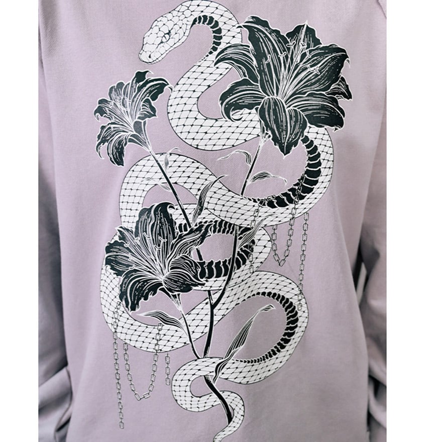 胸元には、モノトーンで描かれた百合の花とそれに絡みつく蛇のアーティスティックなグラフィックが大きくプリントされています。