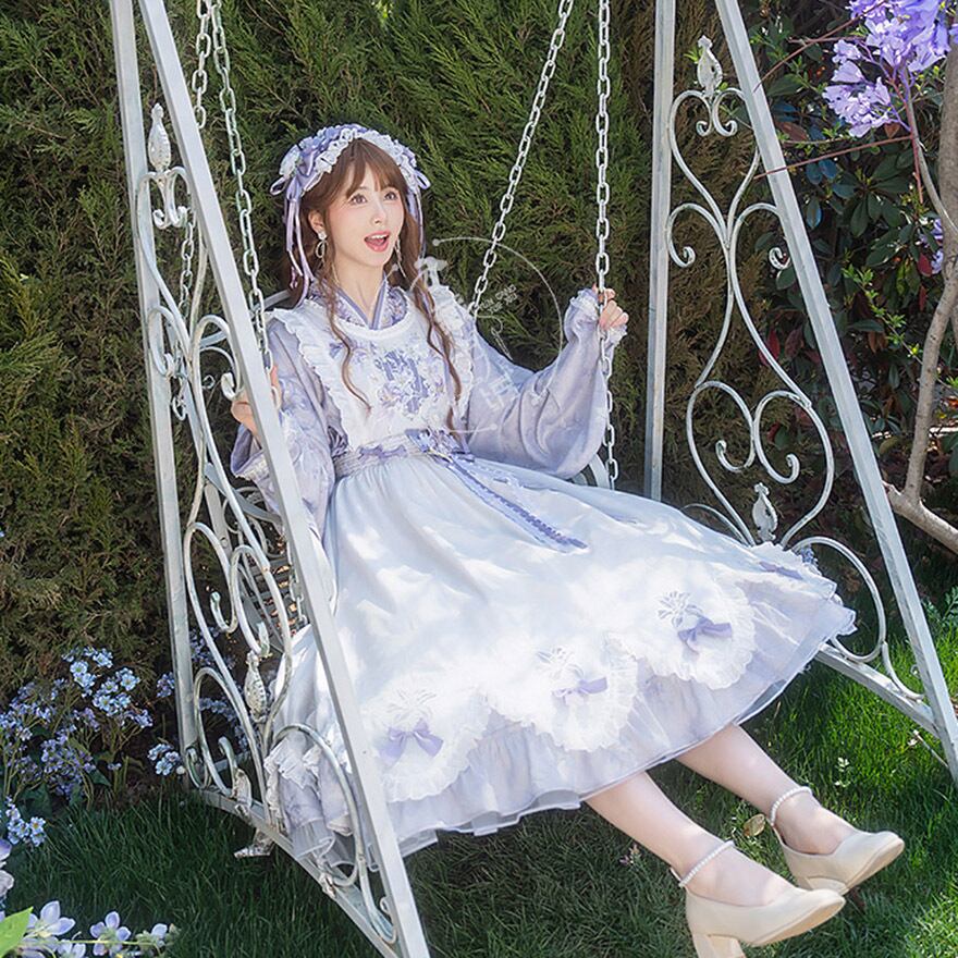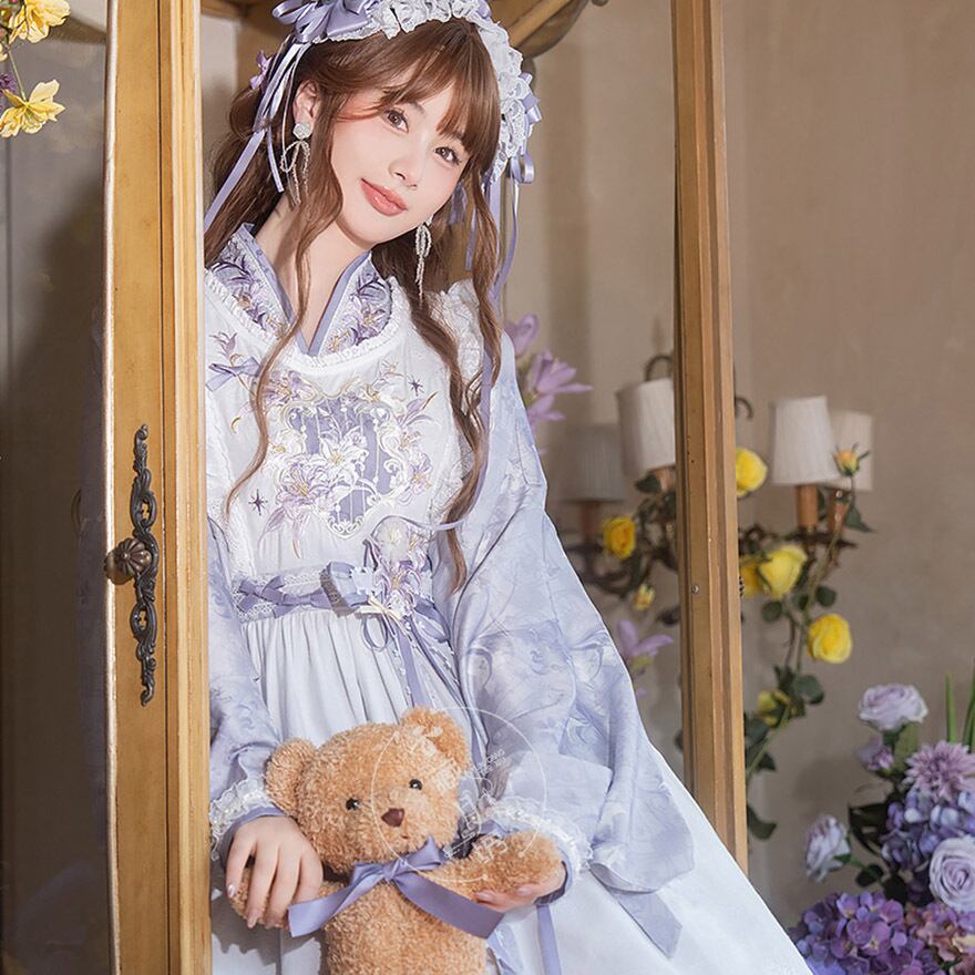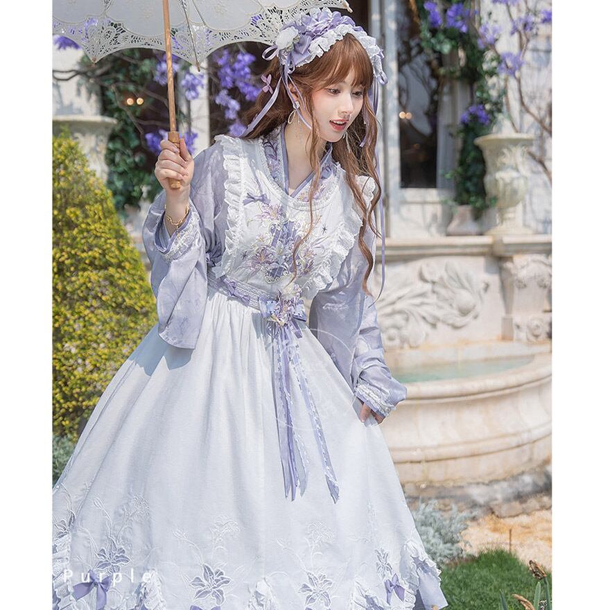 関連キーワード: #ロリィタ #クラロリ #華ロリ #ワンピース #中華風 #メイド服 #刺繍 #レース #パープル #藤色 #幻想的 #お嬢様 #3点セット #サブカル