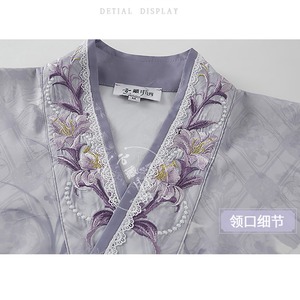 シアー素材で仕立てられた優雅な広袖やチャイナカラーがオリエンタルな雰囲気を醸し出し、胸元やスカートには繊細な花の刺繍が施されています。