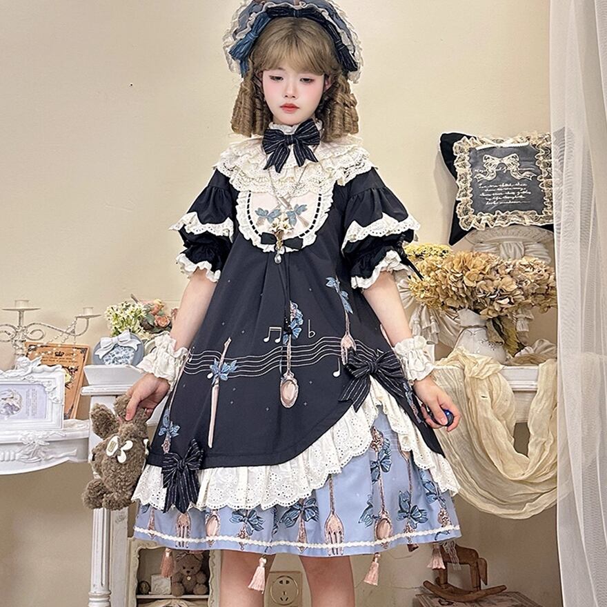 深いネイビーを基調とした生地に、音符や蝶が舞う幻想的なプリントが施されたロリータワンピースです。