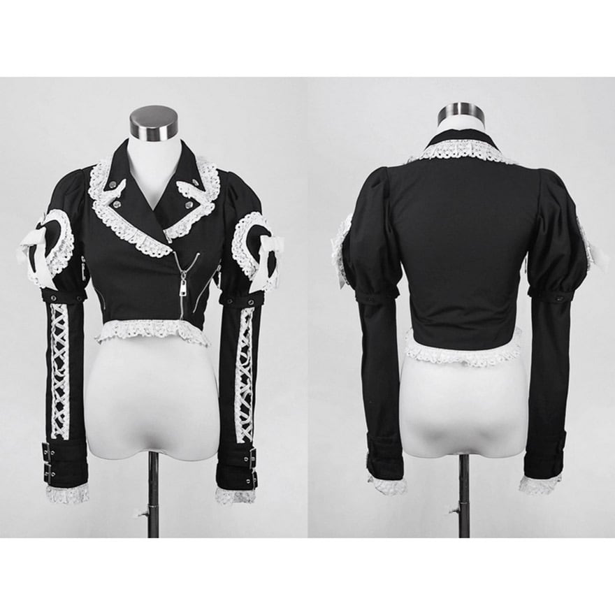 ライダース風のクロップドジャケットと、ふんわり広がるミニスカートのゴシックなセットアップです。
