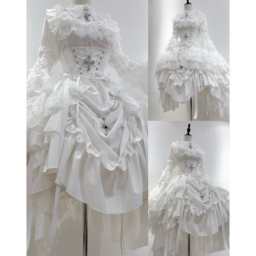 優雅な姫袖、ウエストをきゅっと絞る編み上げのビスチェ、そして前が短く後ろに長く引くドラマティックなフィッシュテールスカートが、完璧なお人形のようなシルエットを創り出します。胸元で揺れる十字架のペンダントと、付属の蝶ネクタイが、より一層世界観を深めます。