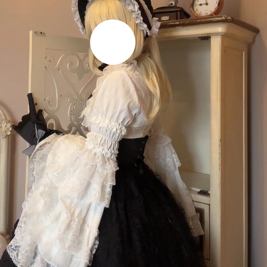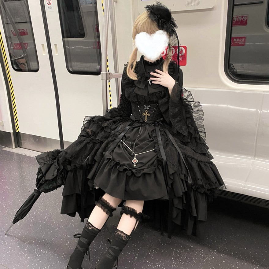 ブラウス、幾重にもフリルが重なるスカートが一体となった、豪華絢爛なゴシックドレスのセットアップです。
