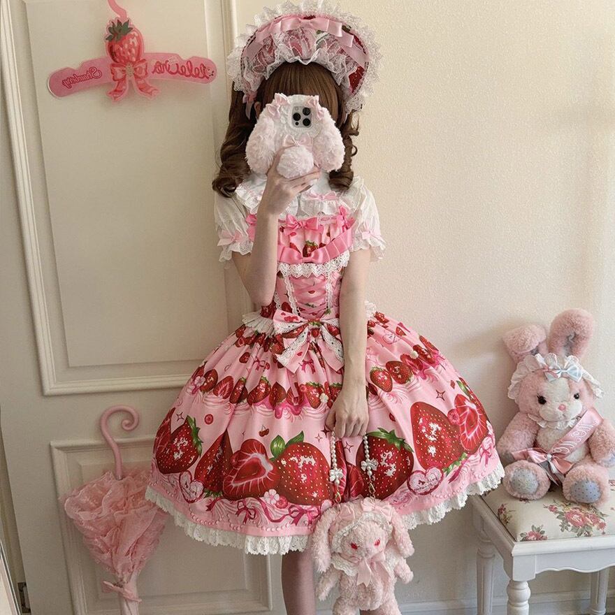 甘ロリファッションの王道であるいちご柄は、何度でも着たくなる魅力があります。