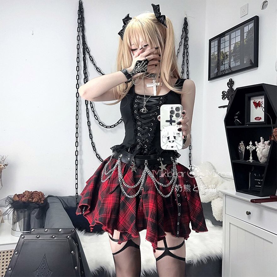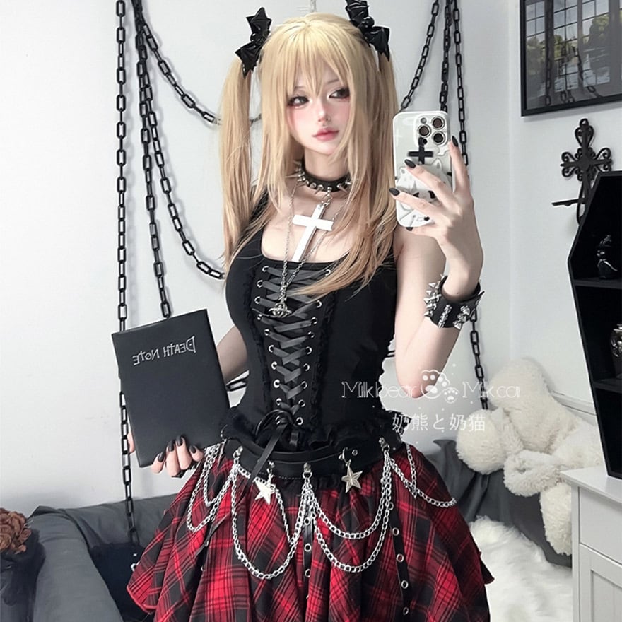 ボディラインを美しく見せる編み上げトップス、赤黒のタータンチェックが目を惹くミニスカート、ガーターベルト風のソックス、星のチャーム付きウエストチェーンの豪華4点セット。