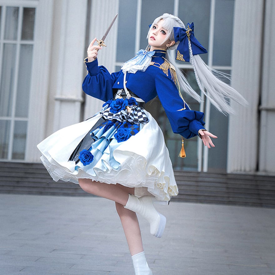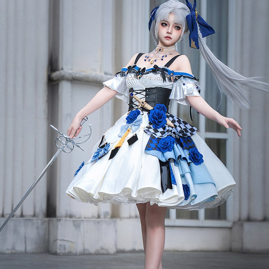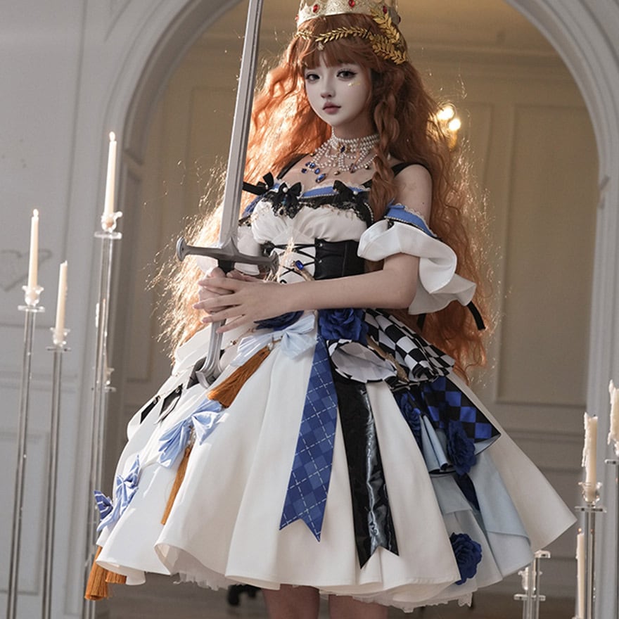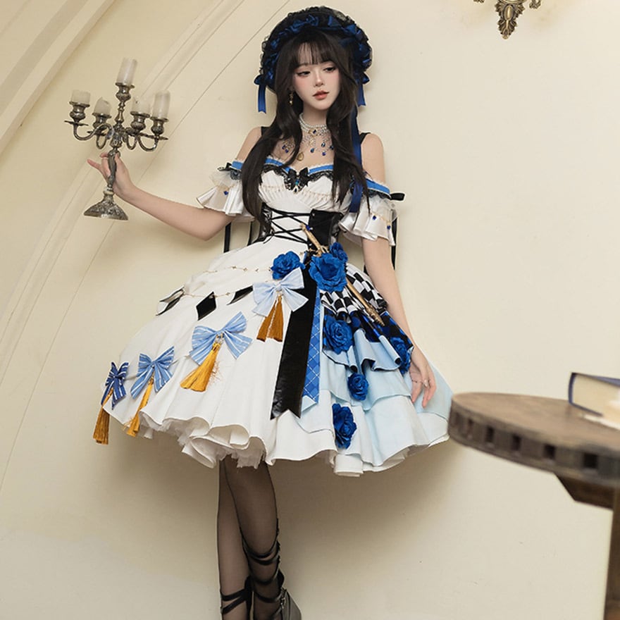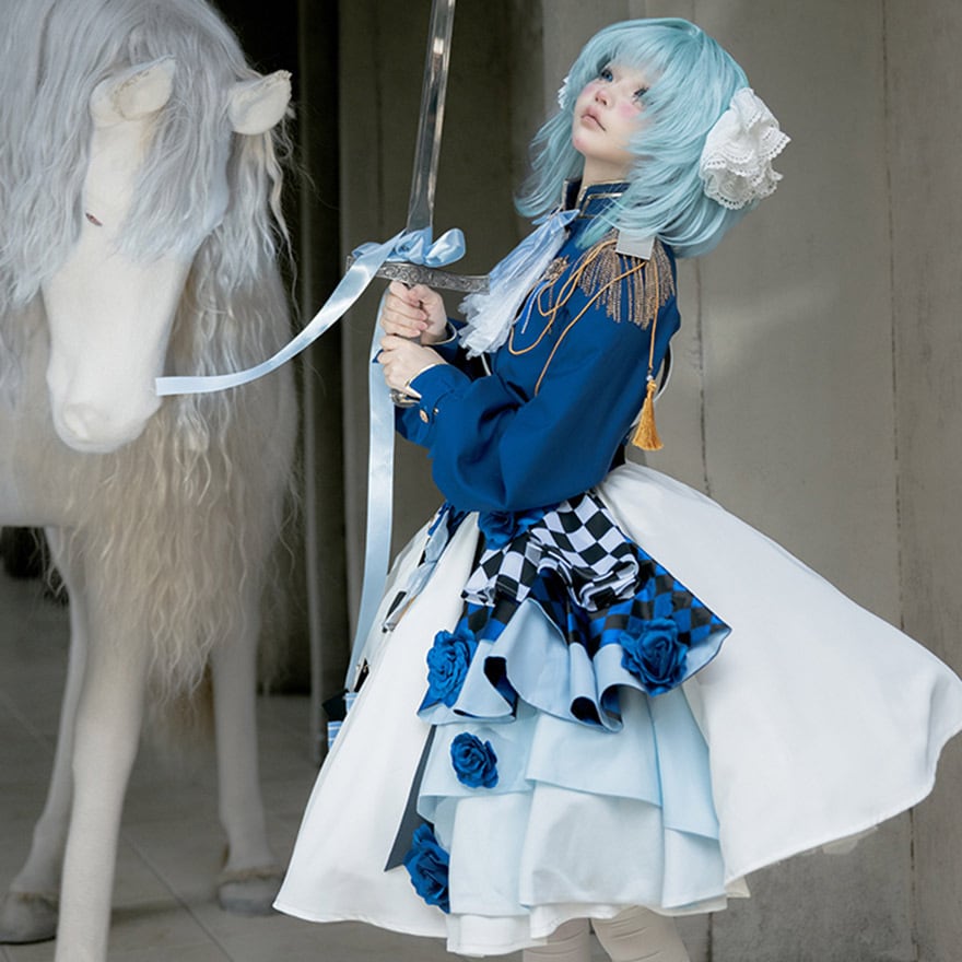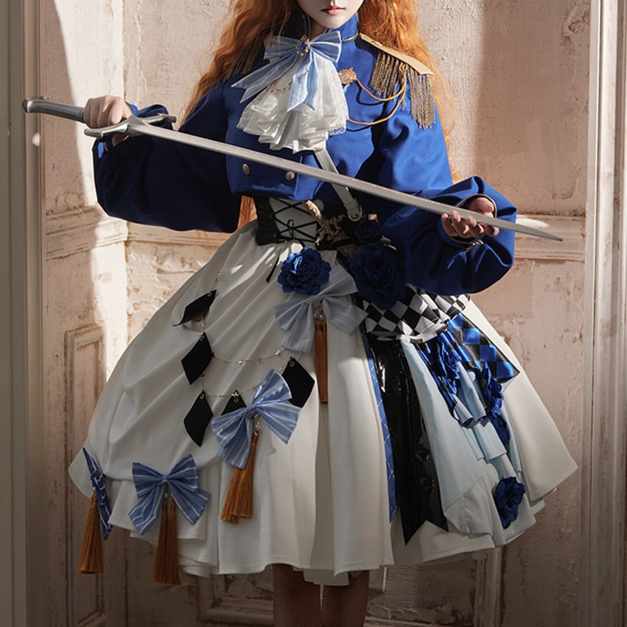 スカートは大胆なアシンメトリーデザイン。片側には青い薔薇やチェッカーフラッグ、アーガイル柄が重ねられ、もう片側には水色のリボンとゴールドのタッセルが飾られています。