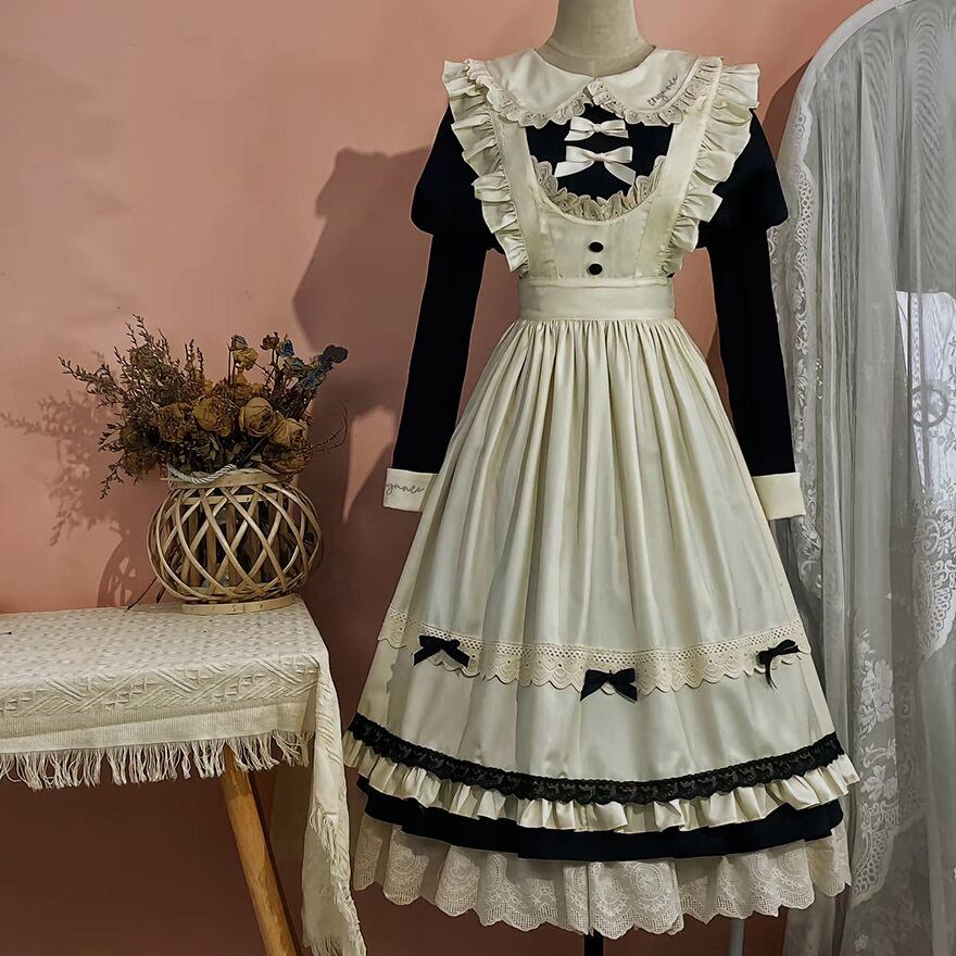 胸元のフリルやリボン、エプロンにあしらわれた繊細なレースと小さなリボンが、隅々までこだわりを感じさせます。