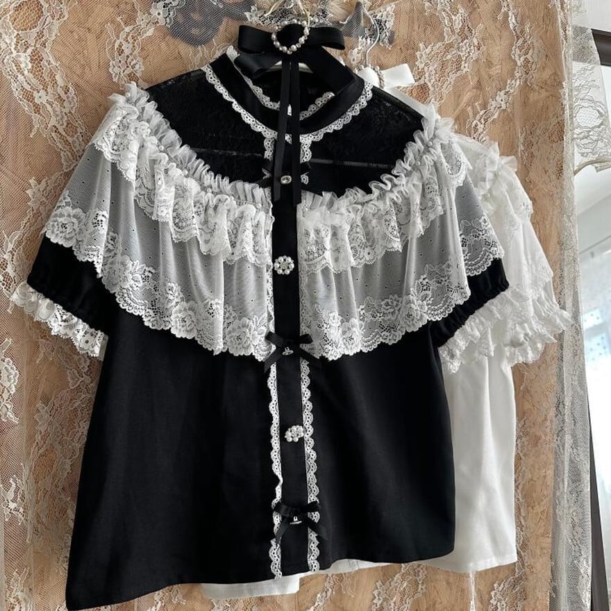 サブカル 服 地雷系 通販 地雷系 甘辛MIX ブラウス レース 継袖付き ゴシック 白 黒 推し活
