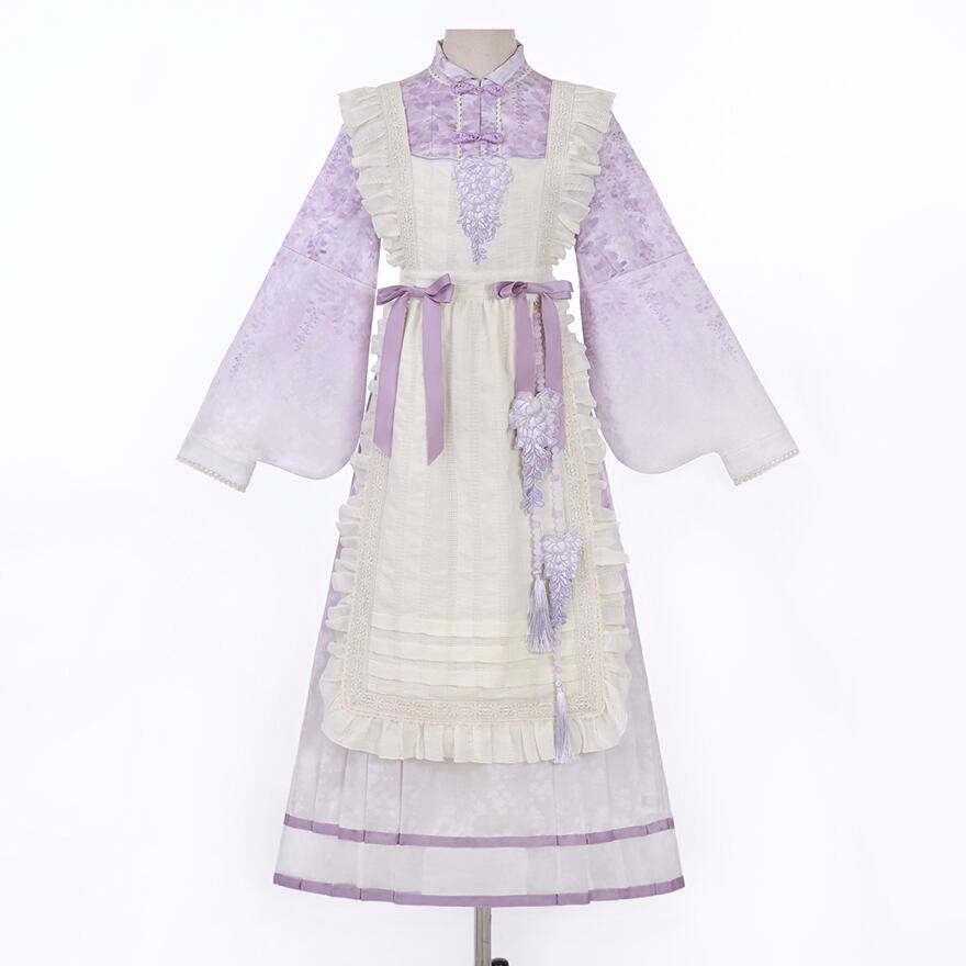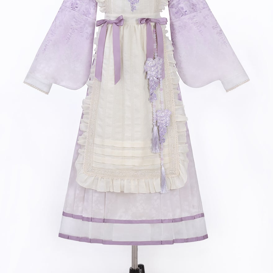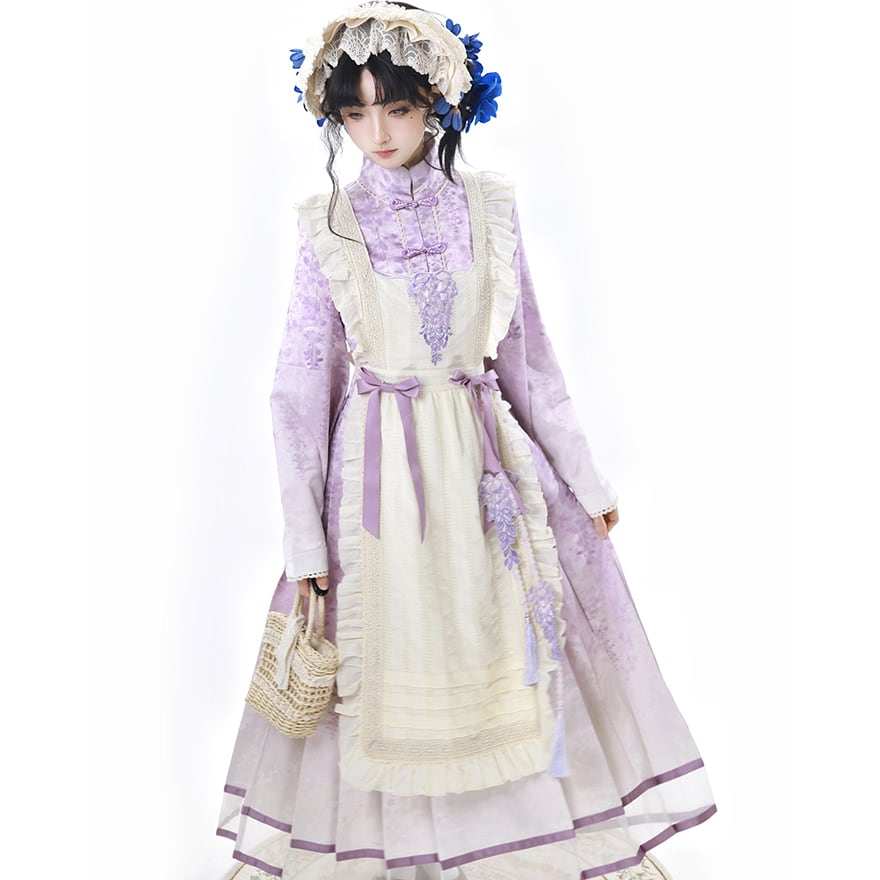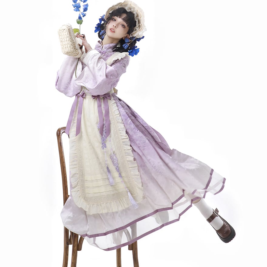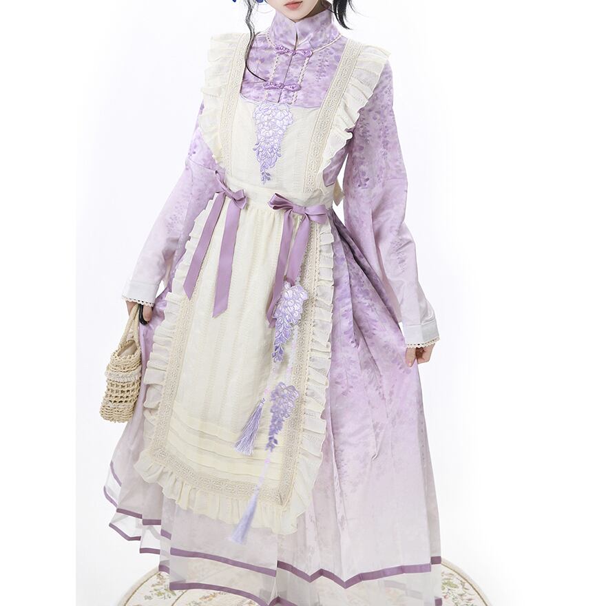 淡いラベンダーのグラデーションが美しい、ロング丈のワンピースとエプロンのセットです。