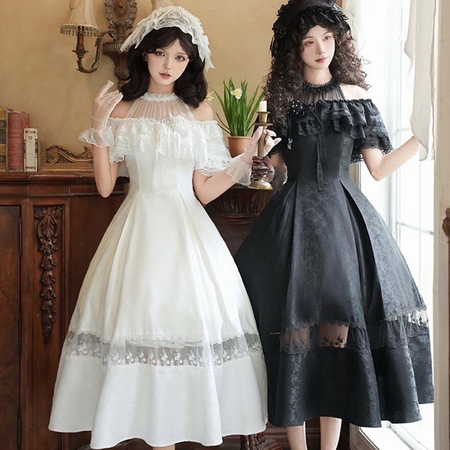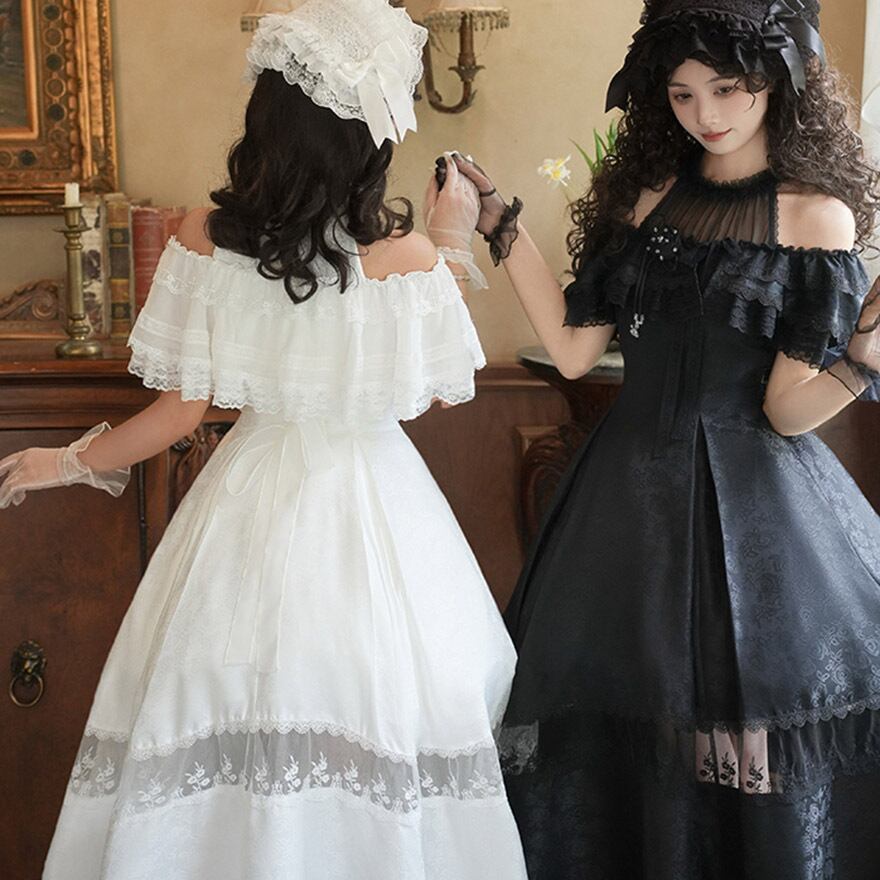 この一着でコーディネートが完成する、ワンピース、ケープ、胸飾り、ヘッドドレスの豪華4点セット。漆黒が美しいブラックと、儚げで清楚なホワイトの2色からお選びいただけます。