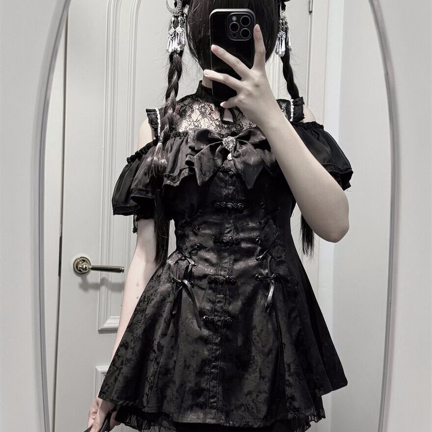 このセットアップは、地雷系ファッションのクールな雰囲気と、中華ロリィタの甘く妖艶な雰囲気をミックスしたデザインが特徴です。