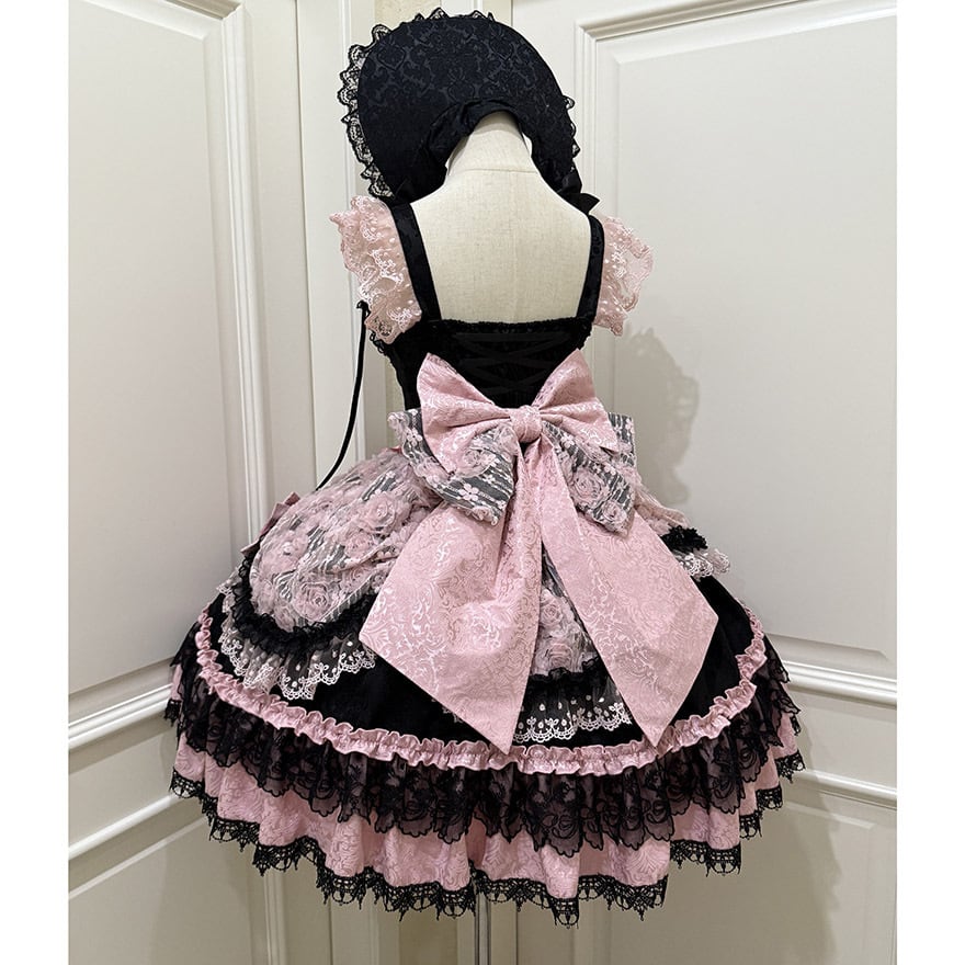 胸元のレースアップと、スカートにあしらわれた立体的な薔薇が目を引く、ダークでゴシックなジャンパースカートです。