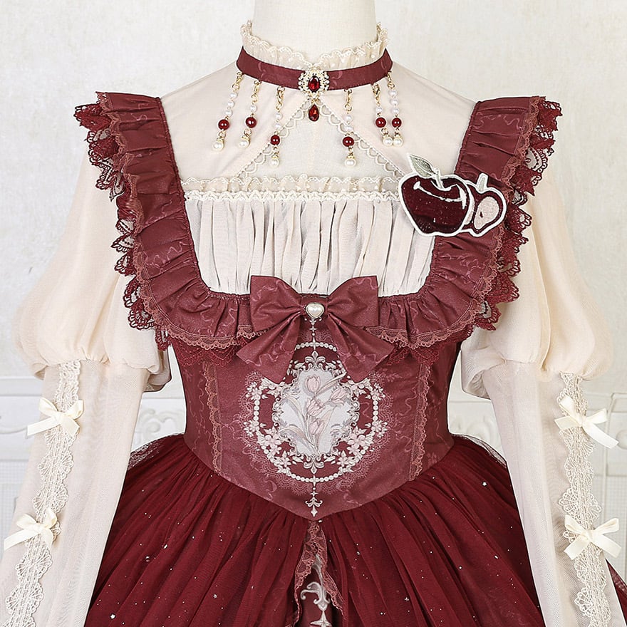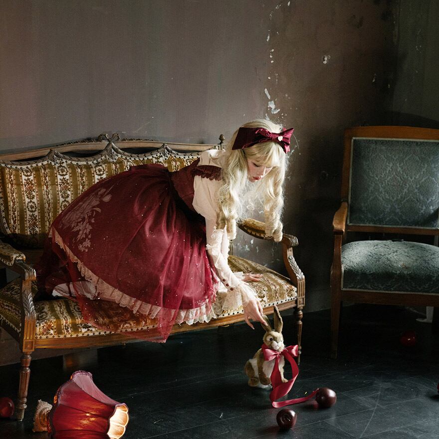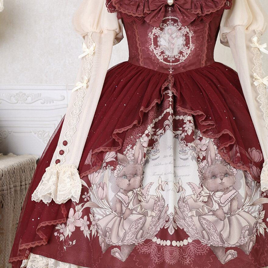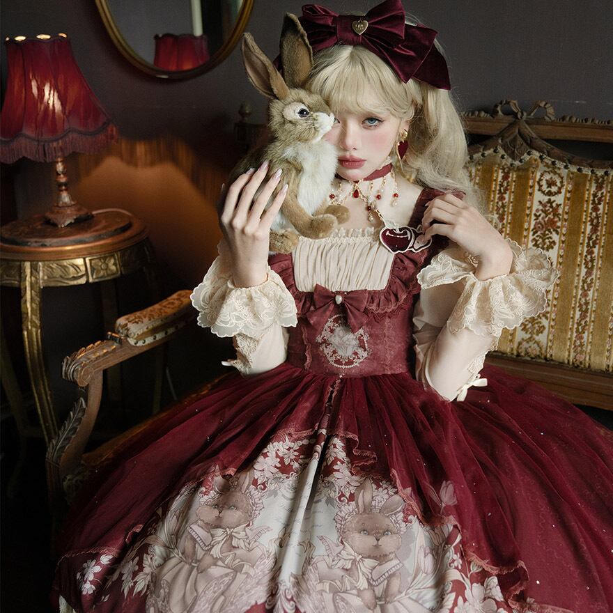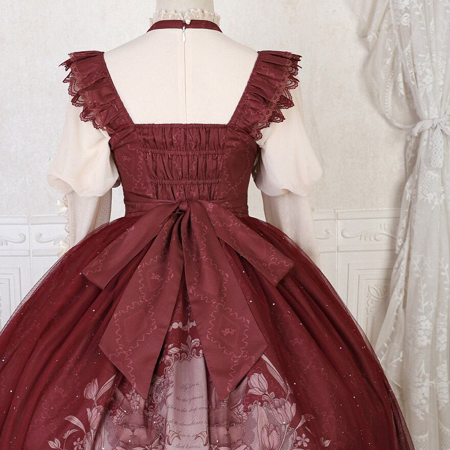 深みのあるワインレッドの生地に、天使たちを描いた幻想的なプリントが映える、クラシカルロリィタのジャンパースカートです。
