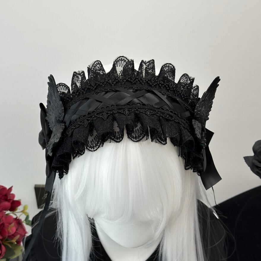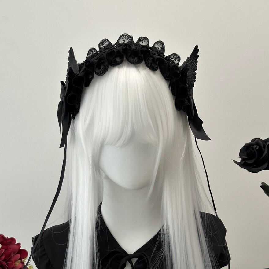 堕天使が髪に宿す、禁断の翼。ゴシックなヘッドドレスが、あなたのミステリアスな魅力を最大限に引き立てる。漆黒の羽根とレースが織りなす、退廃的で美しい存在感が、見る者の心を深く捉える。